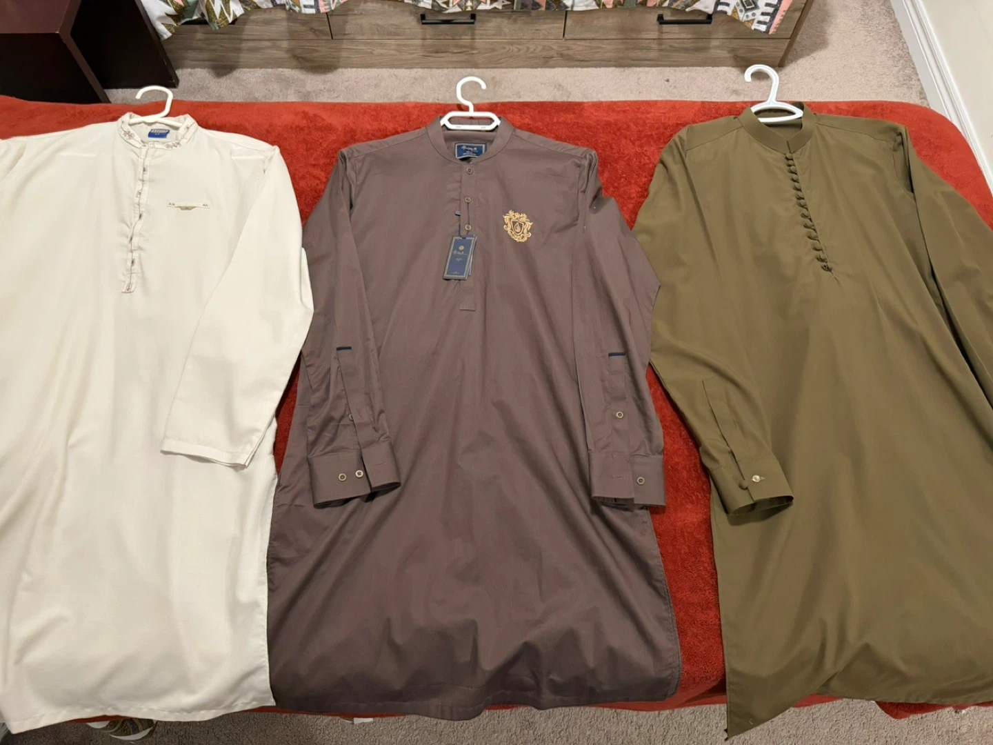 Three men's kameez shalwar sets in beige, brown, and olive green.