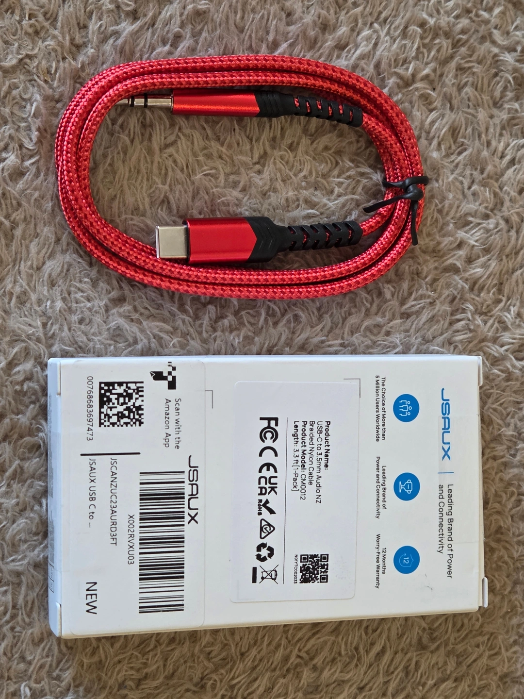 Handy USB-C to 3.5 mm aux cable from JSAUX in a durable red braided jacket – perfect to play music from a USB-C phone or tablet into a car AUX or home speakers. New/open box set with original packaging.