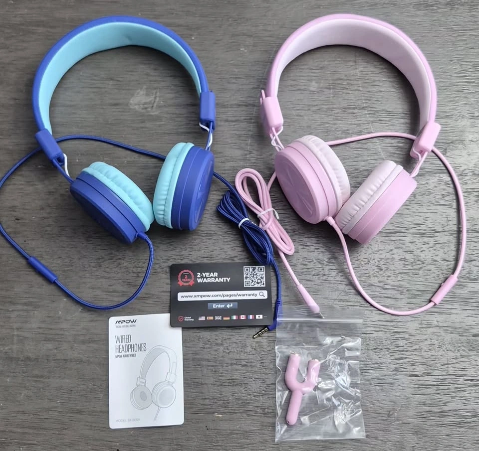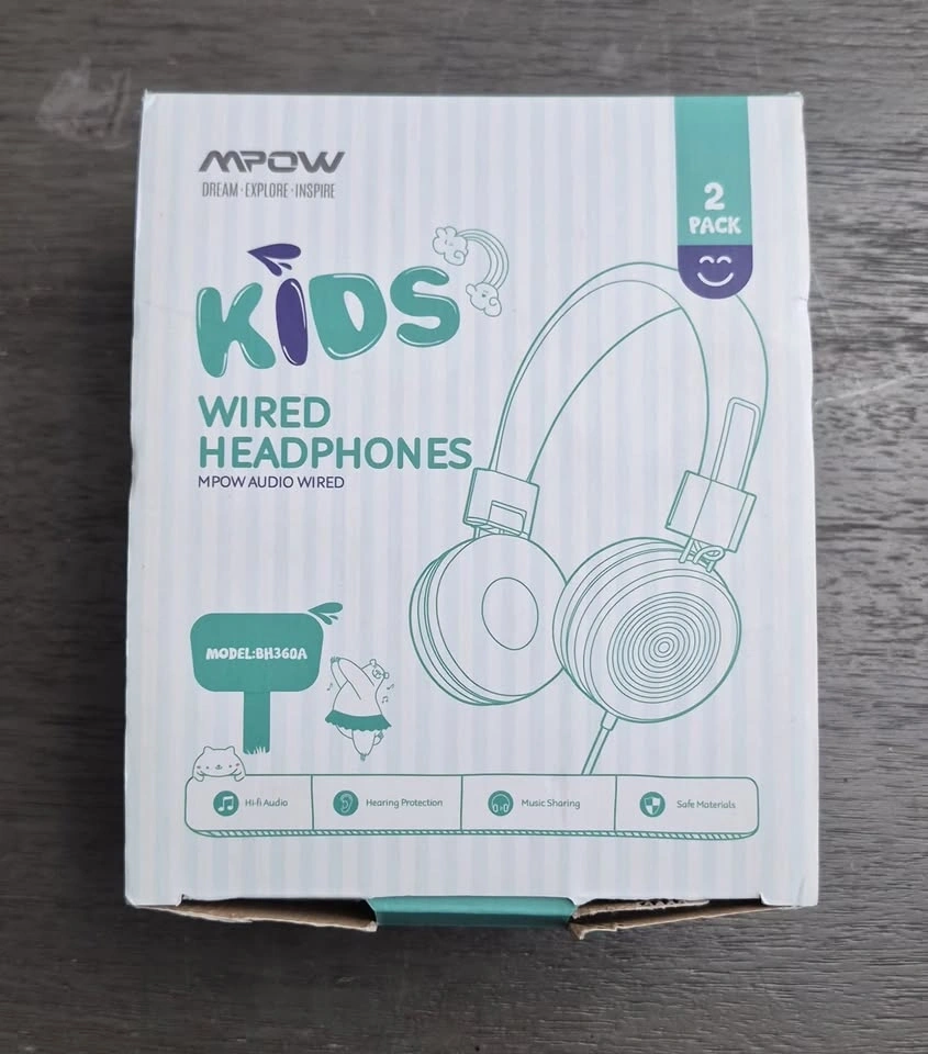Keep your kids entertained with comfort and safety! For sale is a brand-new 2-pack of MPOW wired headphones. Specifically designed for children, these headphones are durable, flexible, and most importantly, safe for their developing ears. Key Features: -Hearing Protection: Volume-limiting technology to protect children's hearing. -Music Sharing: Features a sharing jack so two kids can listen to the same device simultaneously. -Safe & Durable: Made with food-grade, non-toxic materials. They are built to withstand twists and drops. -Hi-Fi Audio: Crisp, clear sound quality for learning or entertainment. -Comfort Fit: Soft ear cushions and adjustable headband for a perfect fit. What's in the box? 2 Wired Headphones (Model: BH360A).