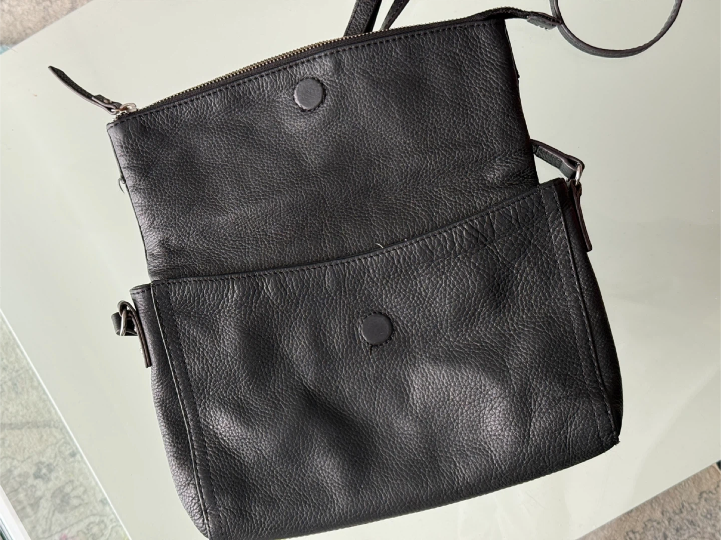 This Lodis crossbody bag is made of black leather. It features a zippered front pocket and a magnetic snap closure for the main compartment. Its adjustable strap makes it easy to wear.