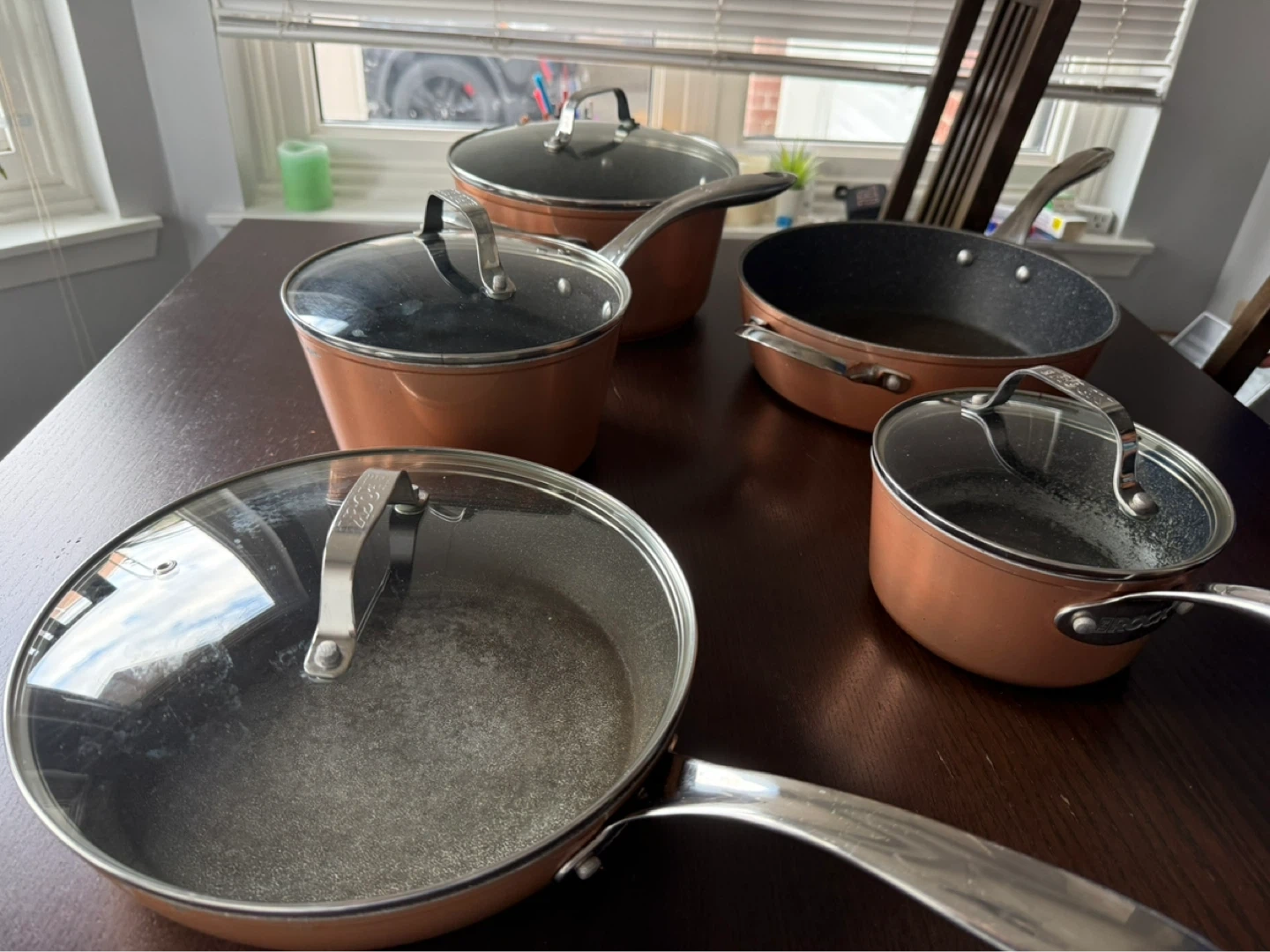 This is a set of copper-coloured pots and pans. They're all equipped with glass lids and have stainless steel handles. Includes multiple sizes for various cooking needs. Aluminum 9