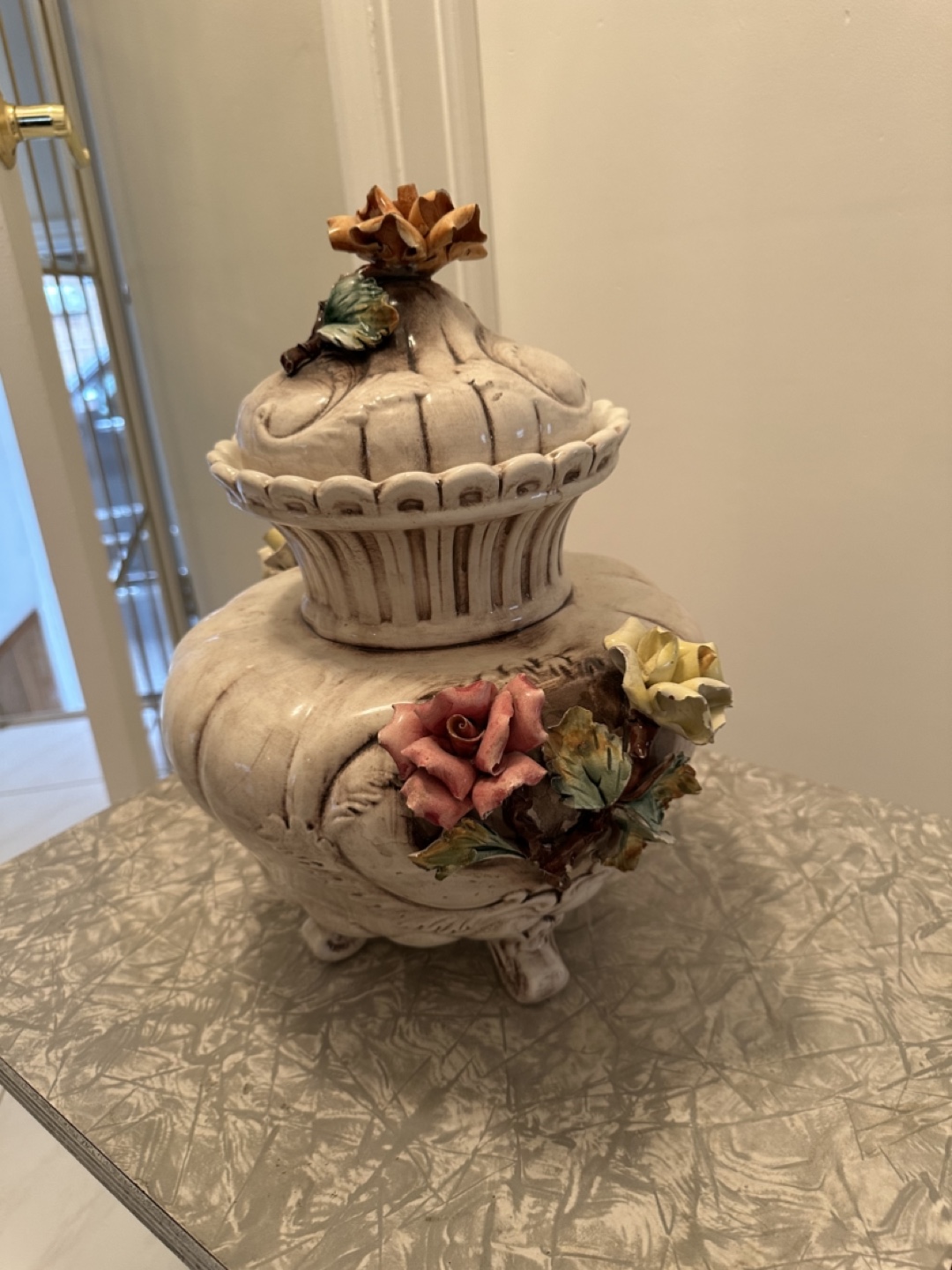 Ornate ceramic urn. Features a lid and three-dimensional floral accents. Cream coloured base. Stands on four feet. Beautiful addition to any home.