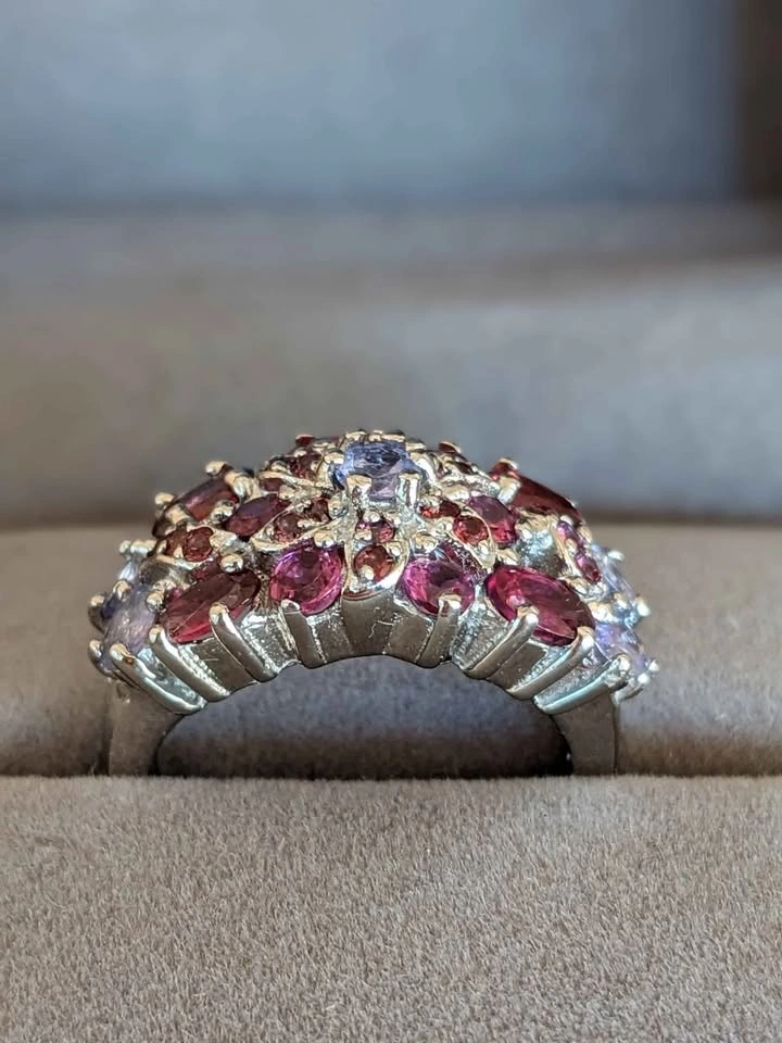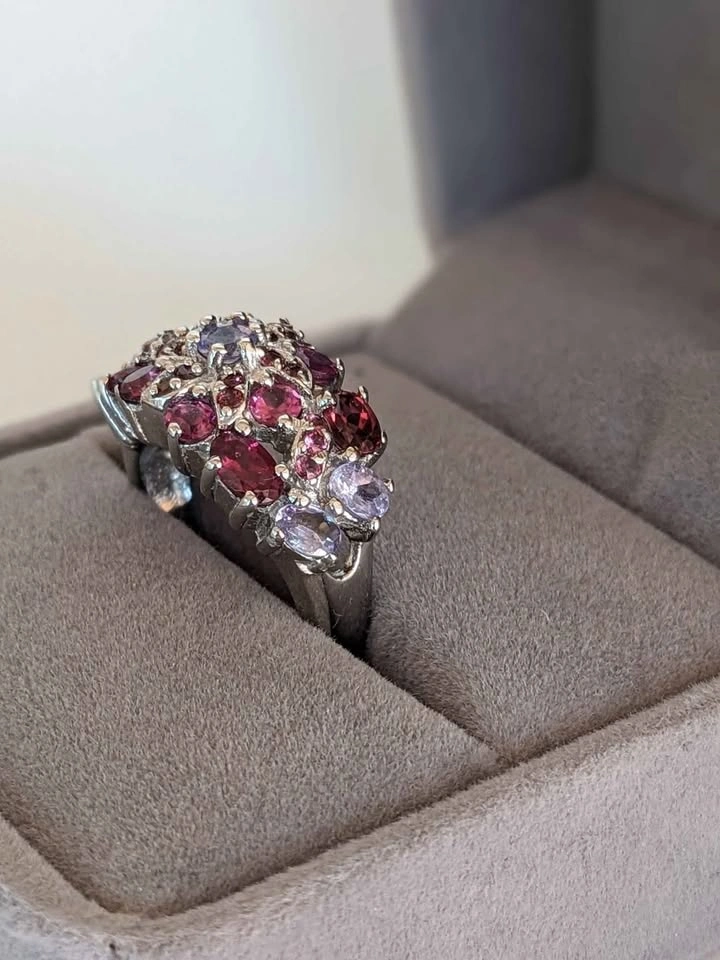 Make a statement with this beautifully crafted ring featuring natural rhodolite garnets and light purple tanzanite gemstones. Set in solid 925 sterling silver, the design evokes a floral burst of color, with deep raspberry-pink rhodolite stones encircling purple tanzanite accents. This piece blends bold elegance with timeless charm—perfect for collectors, gift-givers, or anyone who loves unique gemstone jewelry.
