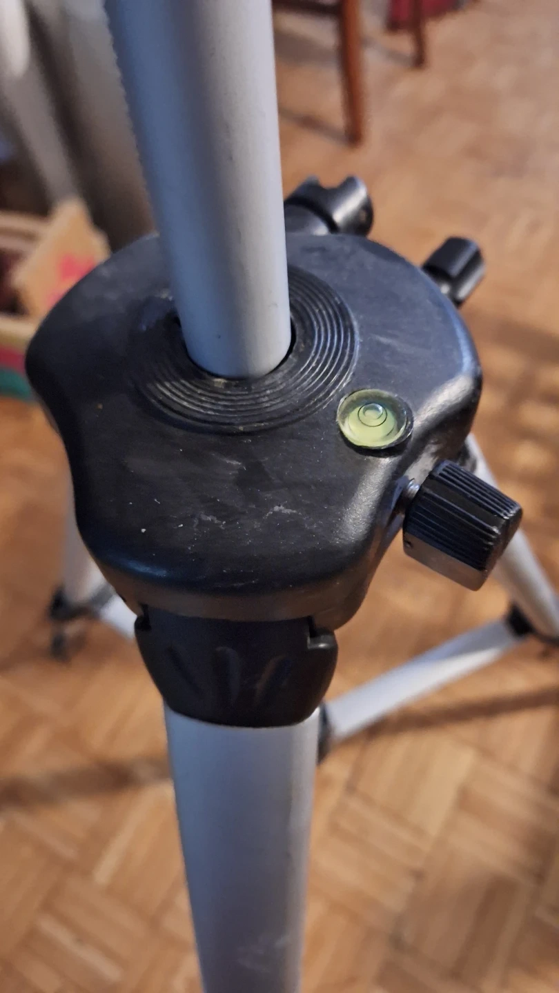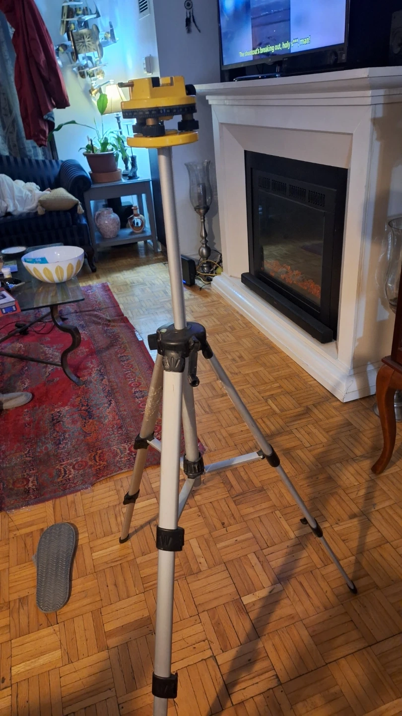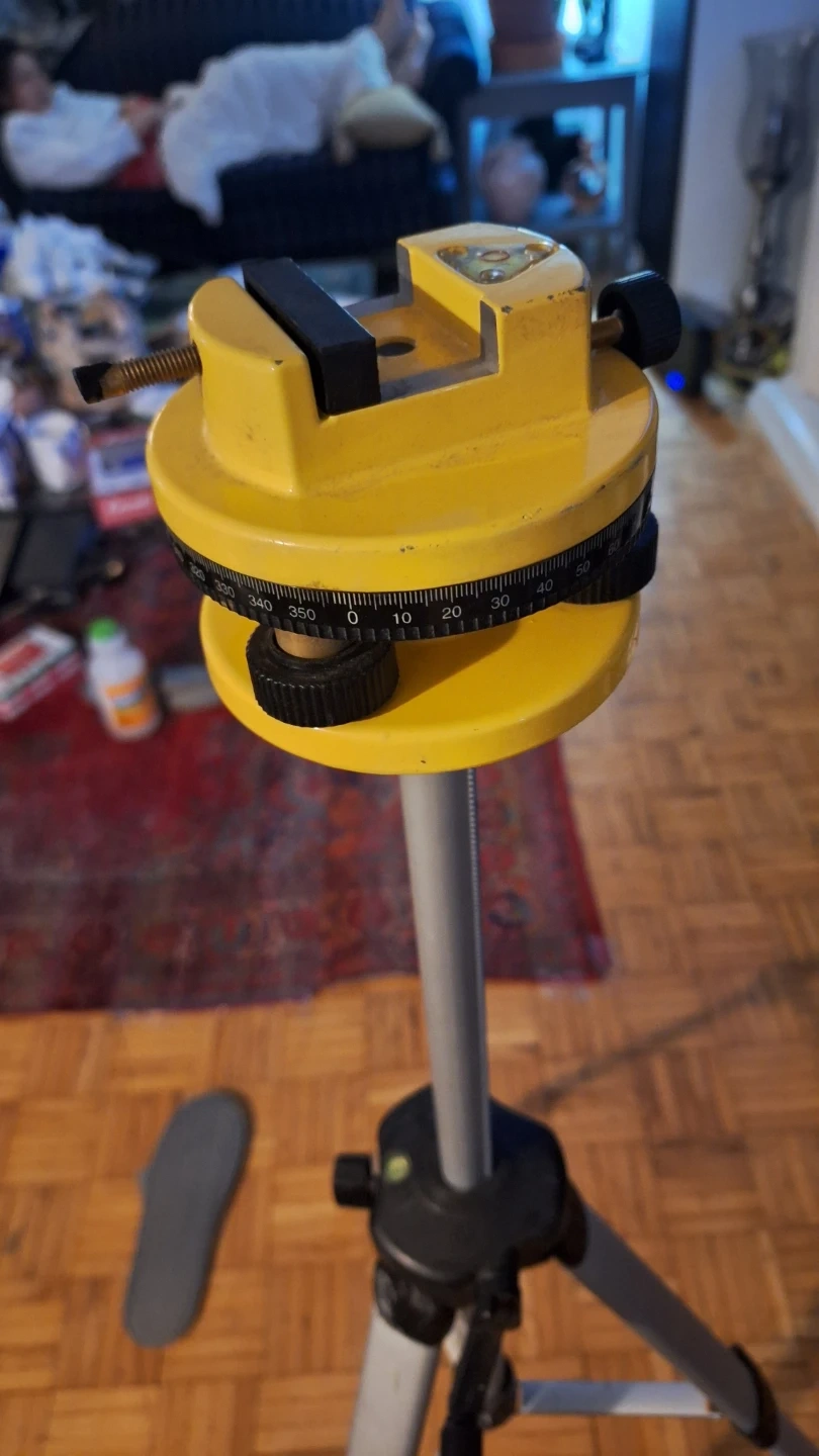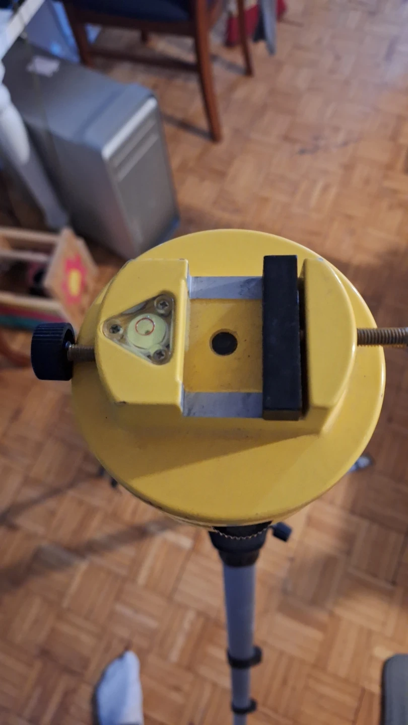This is a sturdy surveyor's tripod with a built-in level. It has adjustable legs and a rotating head for precise positioning. It's useful for setting up surveying equipment or cameras needing a stable base.