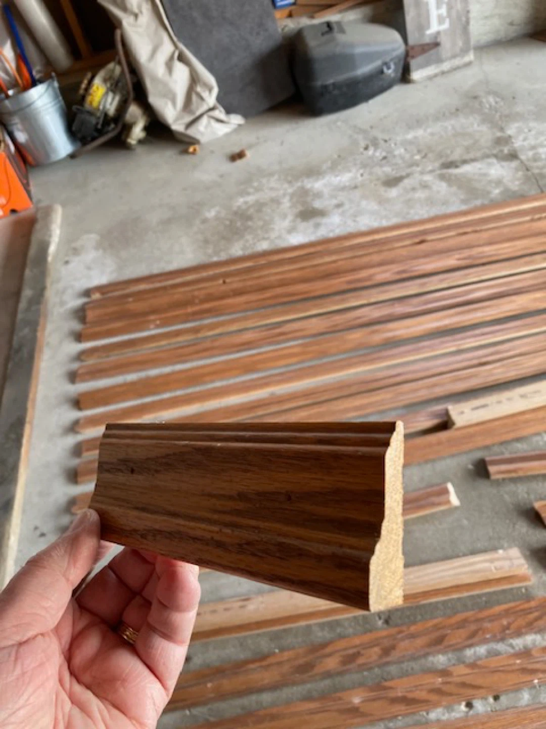 Approximately 100 linear feet of used Oak Baseboards, 5/8” Thick x 2 1/4 '' Wide.