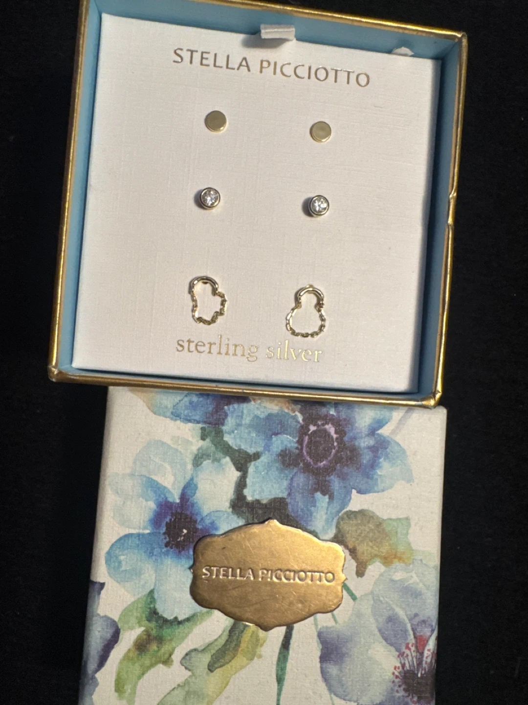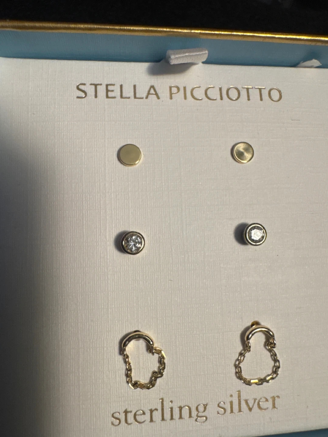 This set includes three pairs of sterling silver earrings. You get two pairs of simple studs, one with a clear stone. There's also a pair of chain-link dangle earrings. Sterling silver material.