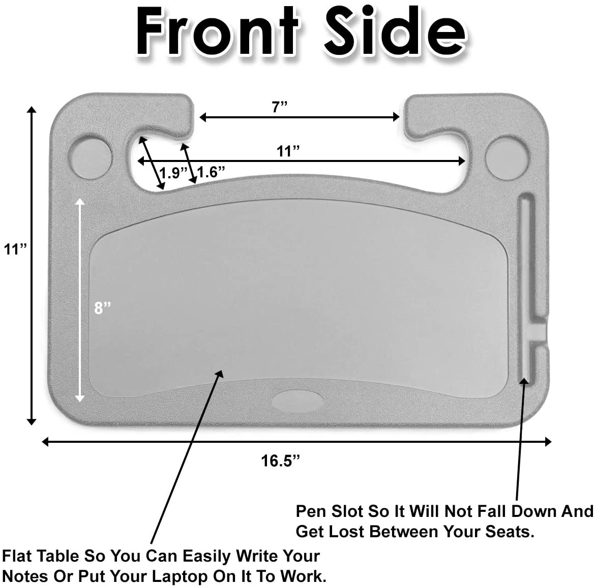 Portable tray table for cars. Flat surface, cup holder, and pen slot. Great for laptops, food, or writing. Easy to use.