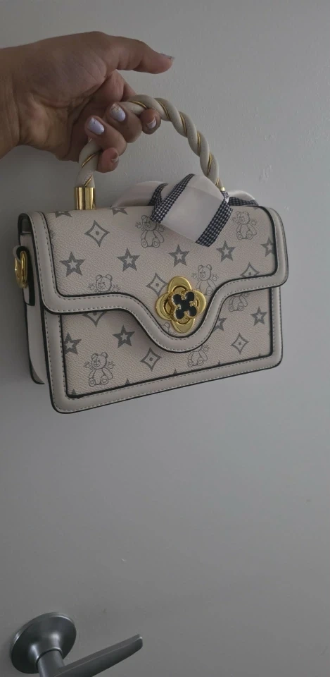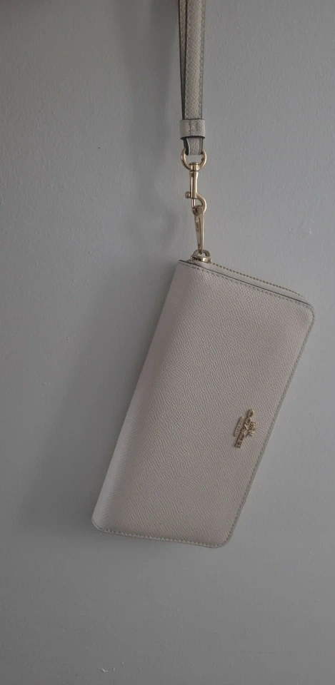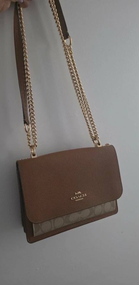 A stylish brown Coach crossbody bag with signature print details. It features a gold chain strap and a flap closure.