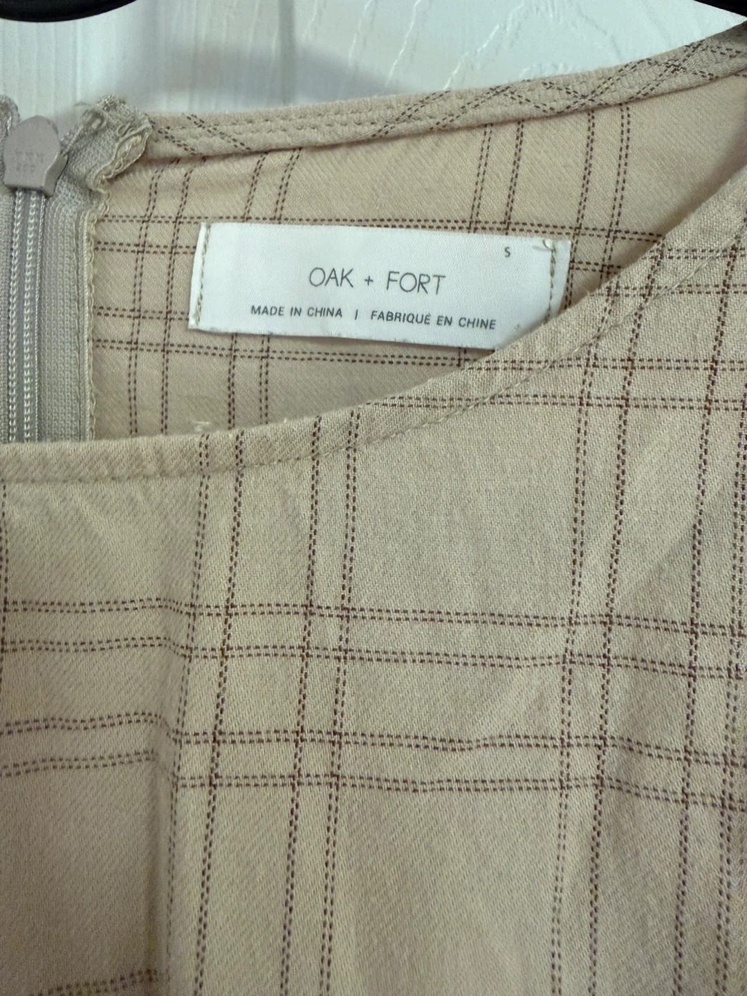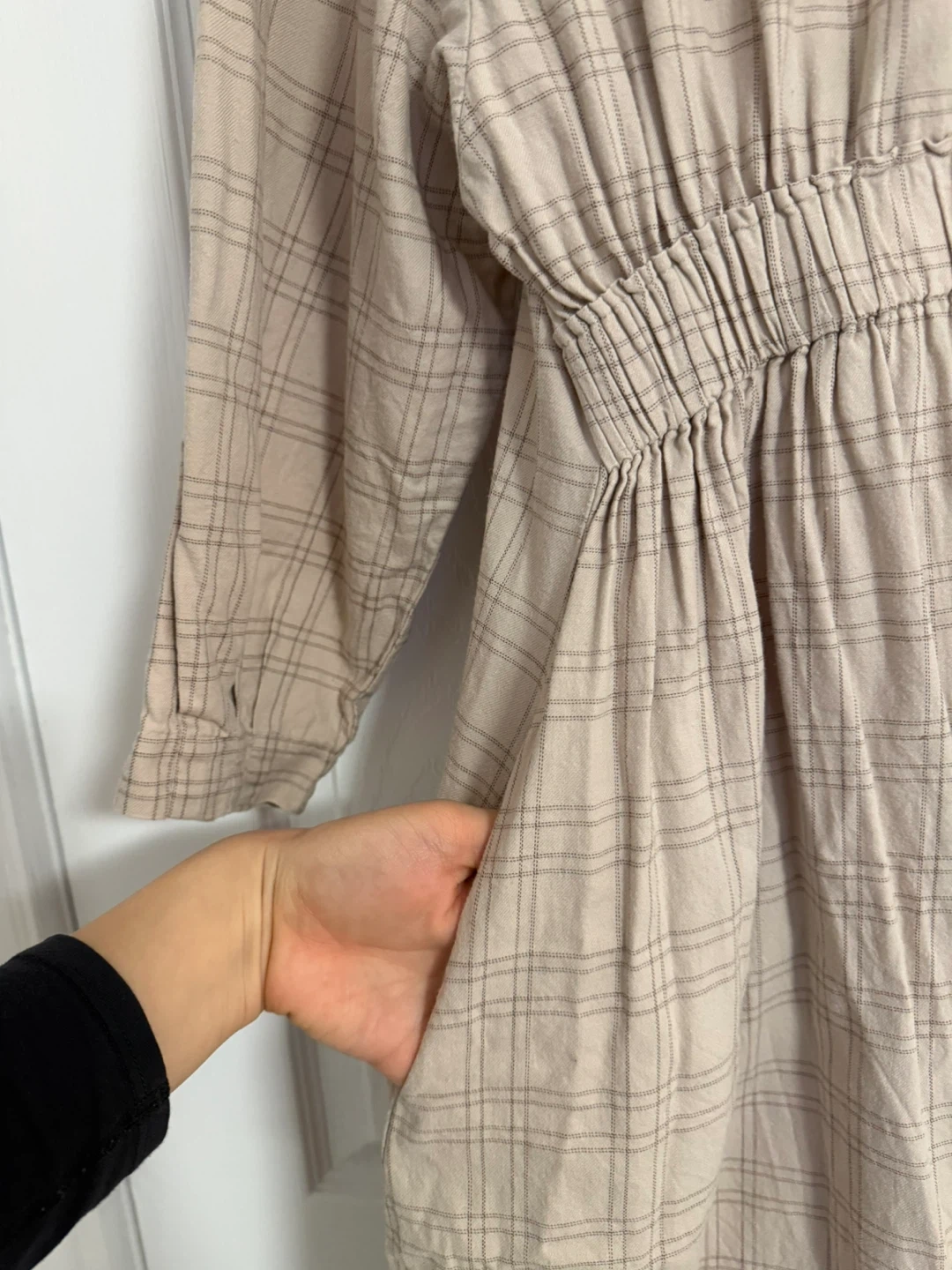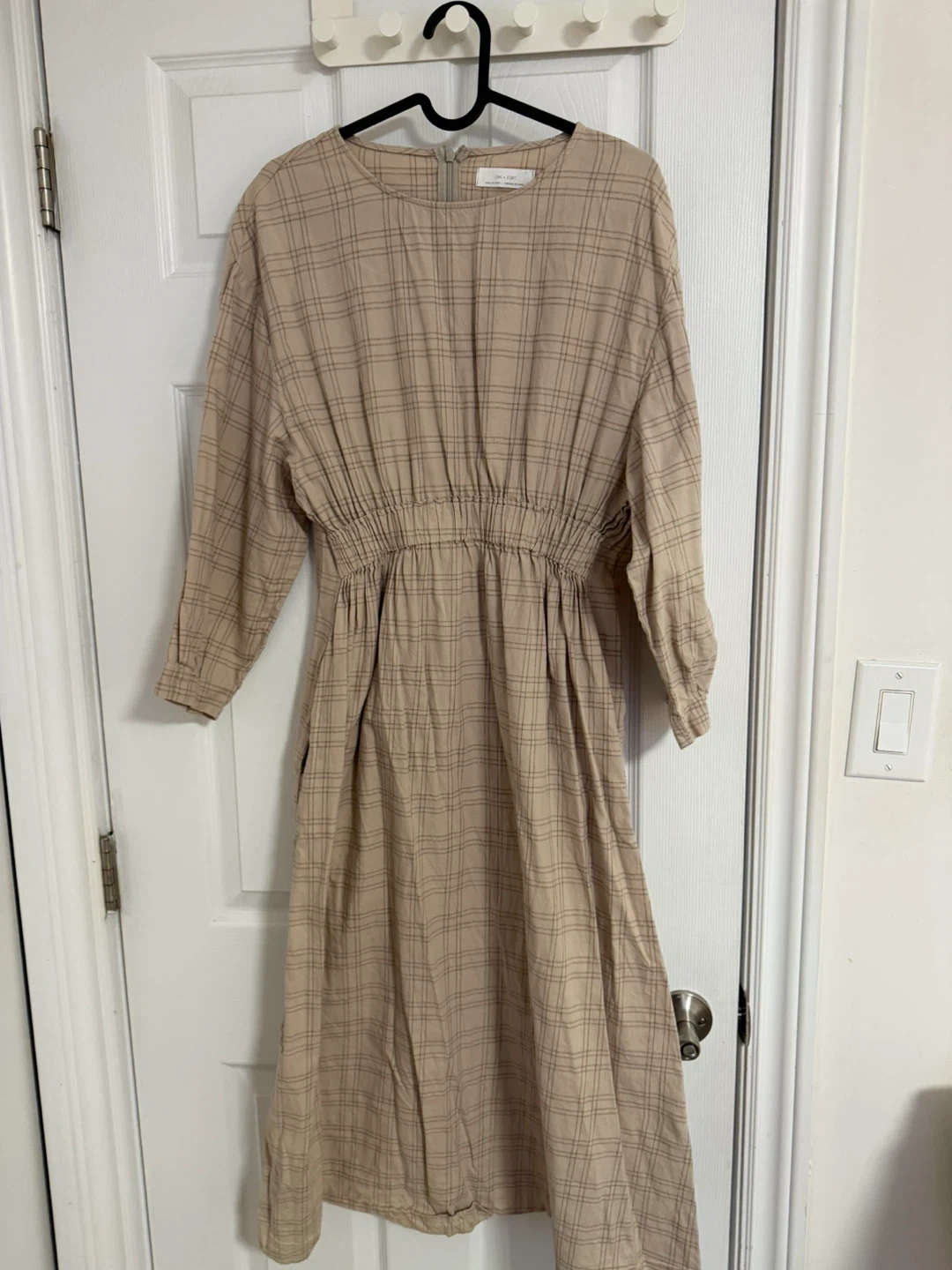 This is a beige plaid midi dress from Oak + Fort. It's a size small with long sleeves and pockets. The waist is cinched with elastic for a comfortable fit.