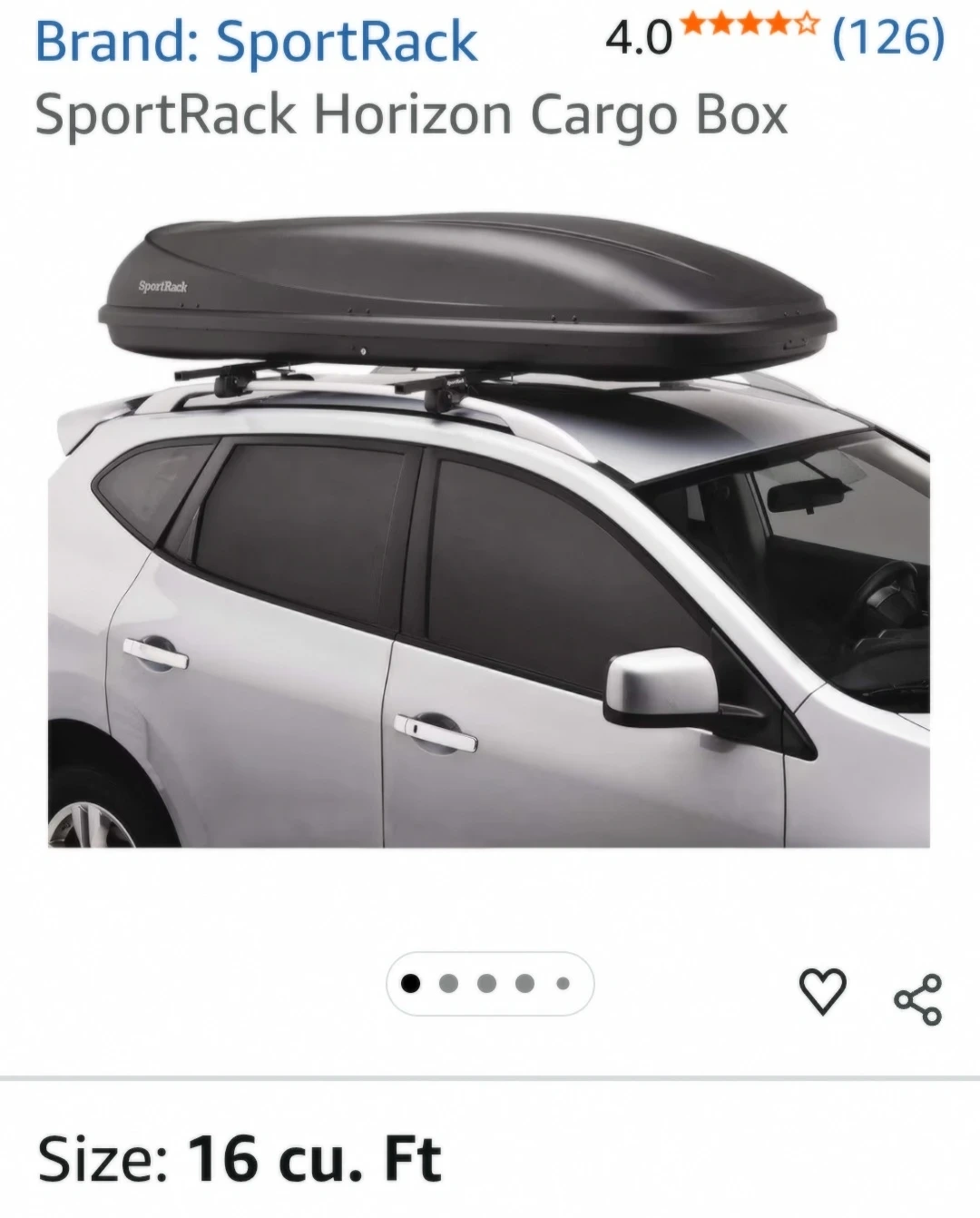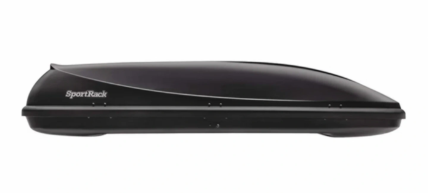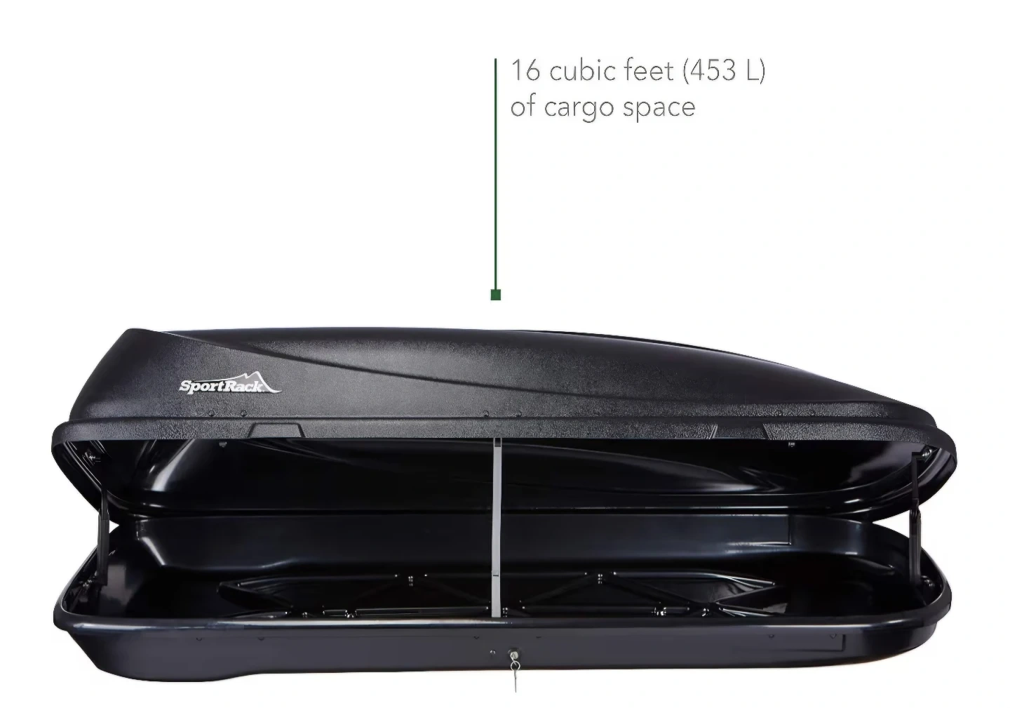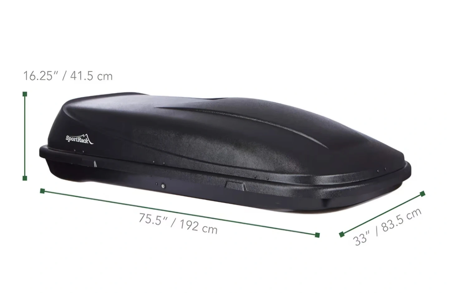 This is a black SportRack Horizon cargo box with 16 cubic feet of storage space. It's made of durable plastic and includes easy-to-use mounting hardware. Dimensions are 75.5" L x 33" W x 16.25" H.