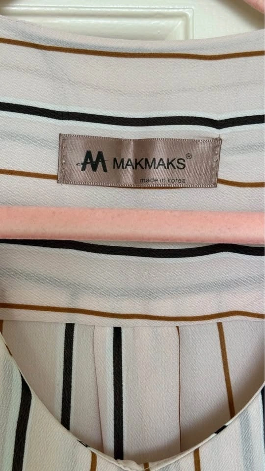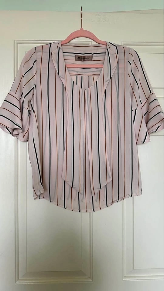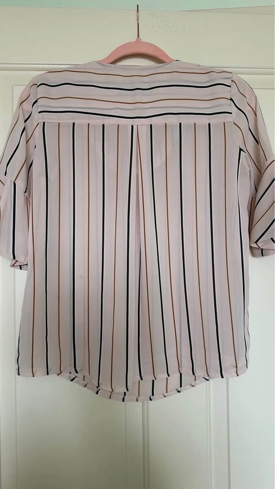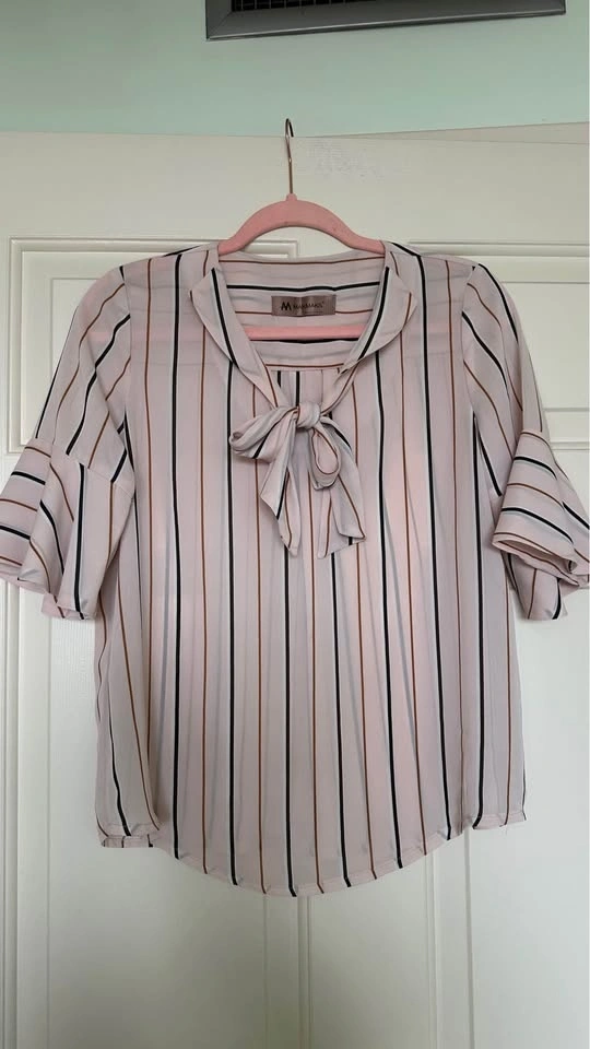 Moving sale. Items available until Wednesday. Pickup at Yonge Sheppard Centre (4841 Yonge St). Cash only. Stylish MAKMAKS blouse. Light pink with black, brown, and light blue stripes. Has a tie-front neckline and ruffle sleeves. Made in Korea. Looks great for work or casual outings. Size s.