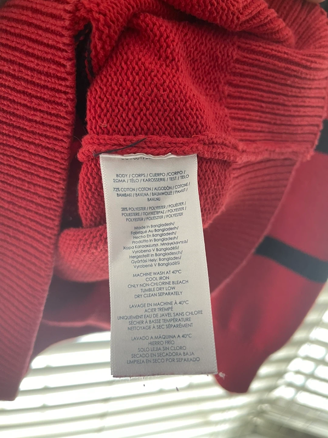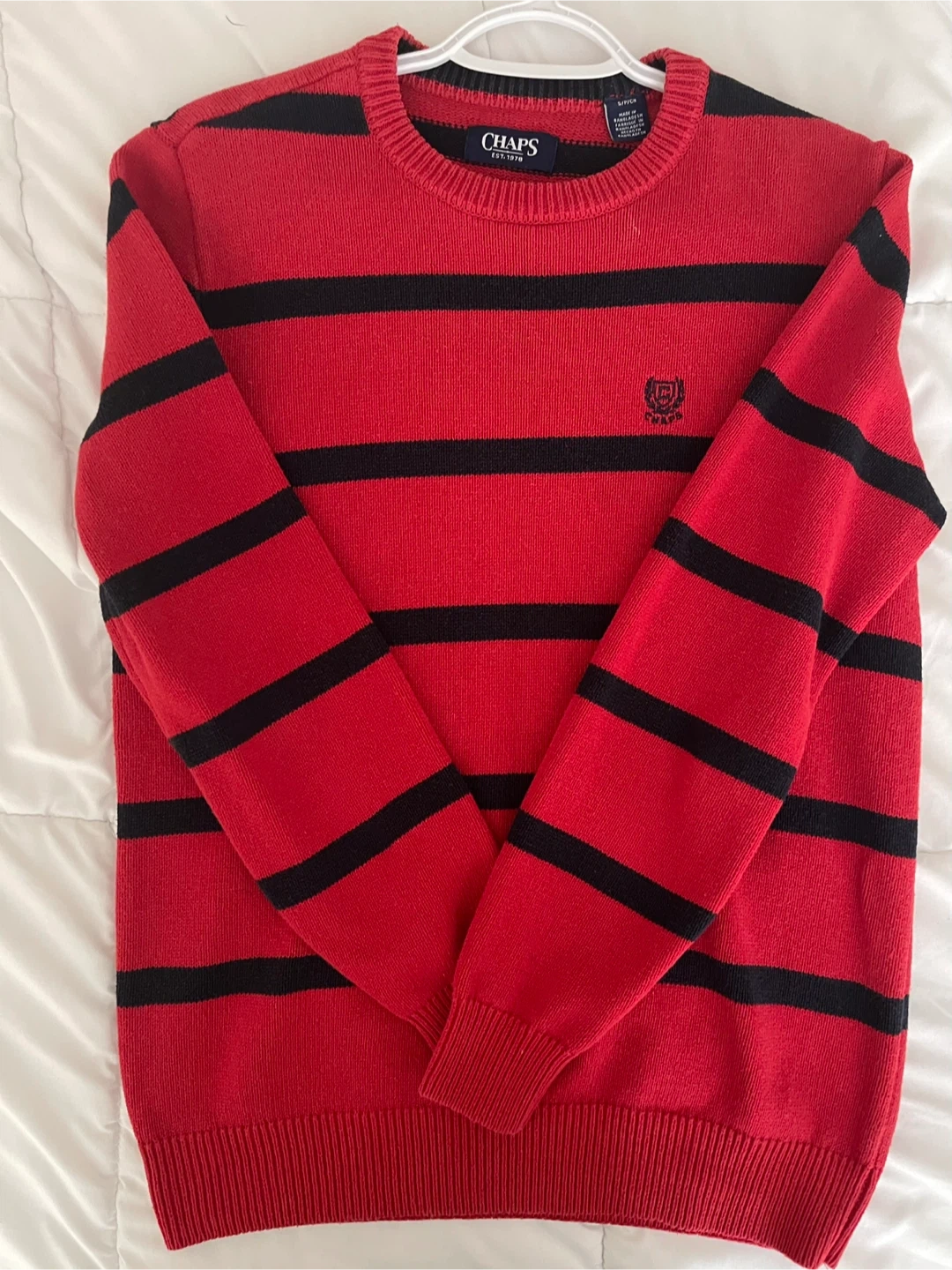 Selling a Chaps crew neck sweater in red with black stripes. It's a size small and made of 72% cotton and 28% polyester. Machine washable!