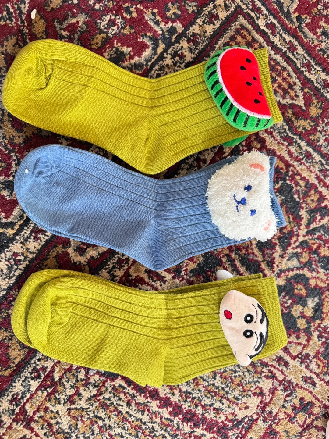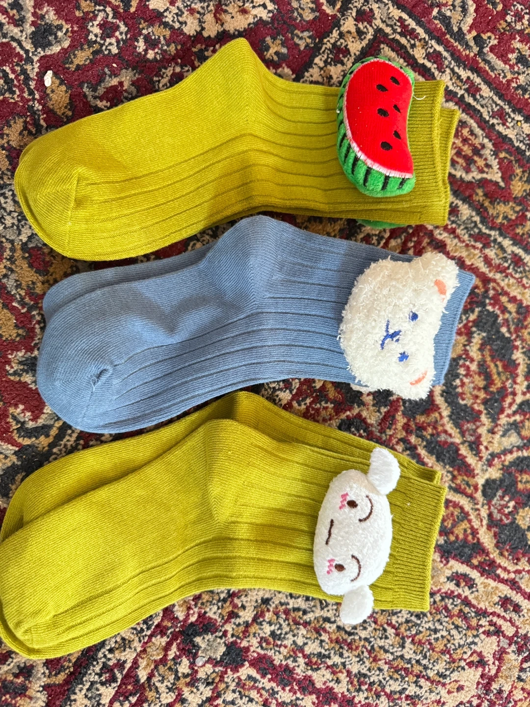 Three pairs of adorable, ribbed socks for kids. Features playful designs like a watermelon slice and cute animal faces. Made with soft, comfortable material for everyday wear. Perfect for adding a fun touch to any outfit!