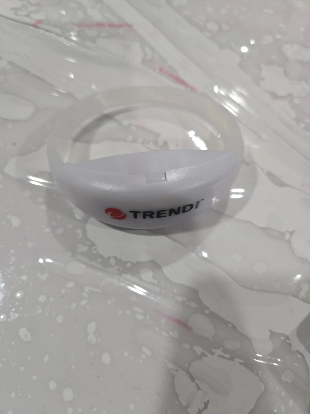 This is a TRENDi brand white LED wristband. It's made of silicone material. This wristband is great for concerts or events!