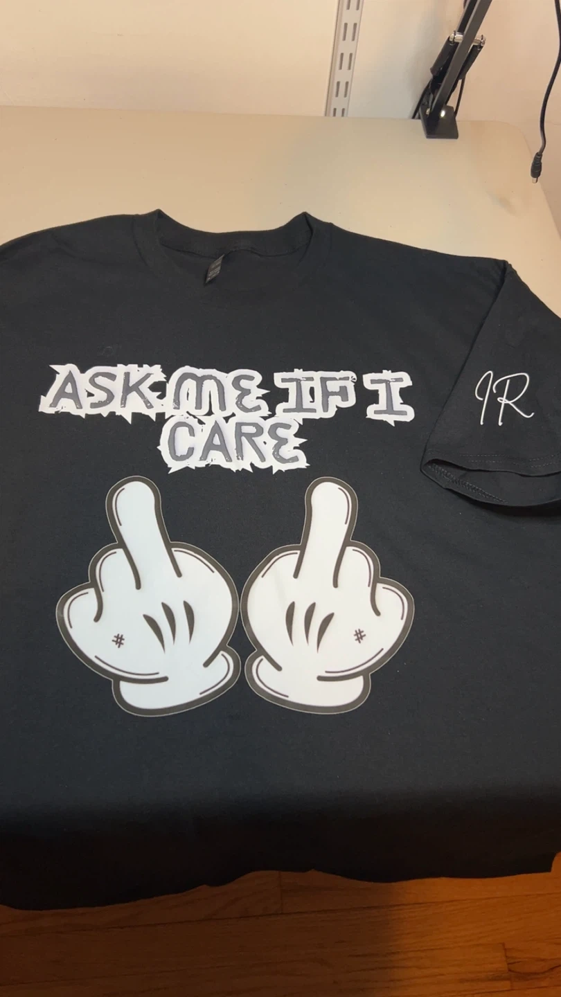 Black short-sleeve t-shirt with a graphic print that says "Ask Me If I Care" and two cartoon hands giving the middle finger. Features "JR" embroidered on the right sleeve. Cotton material.