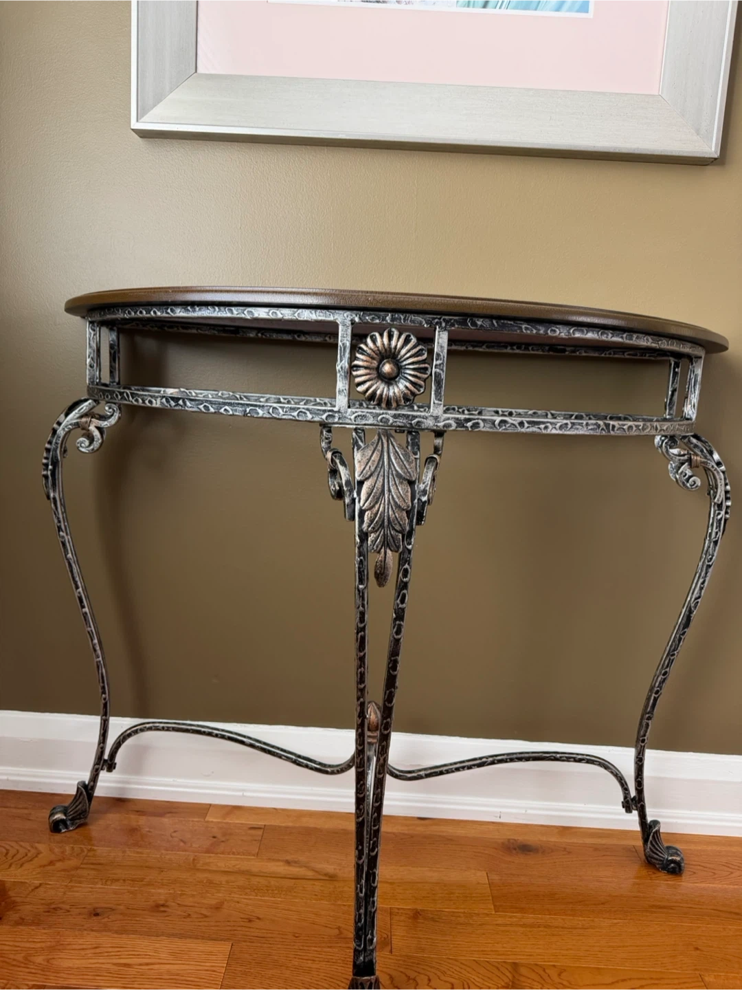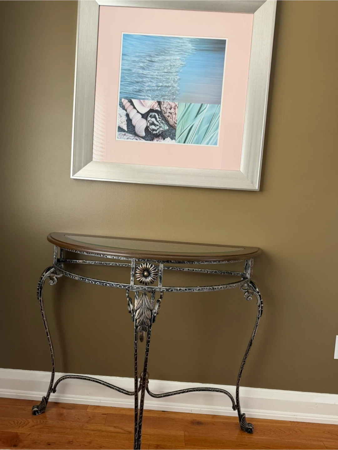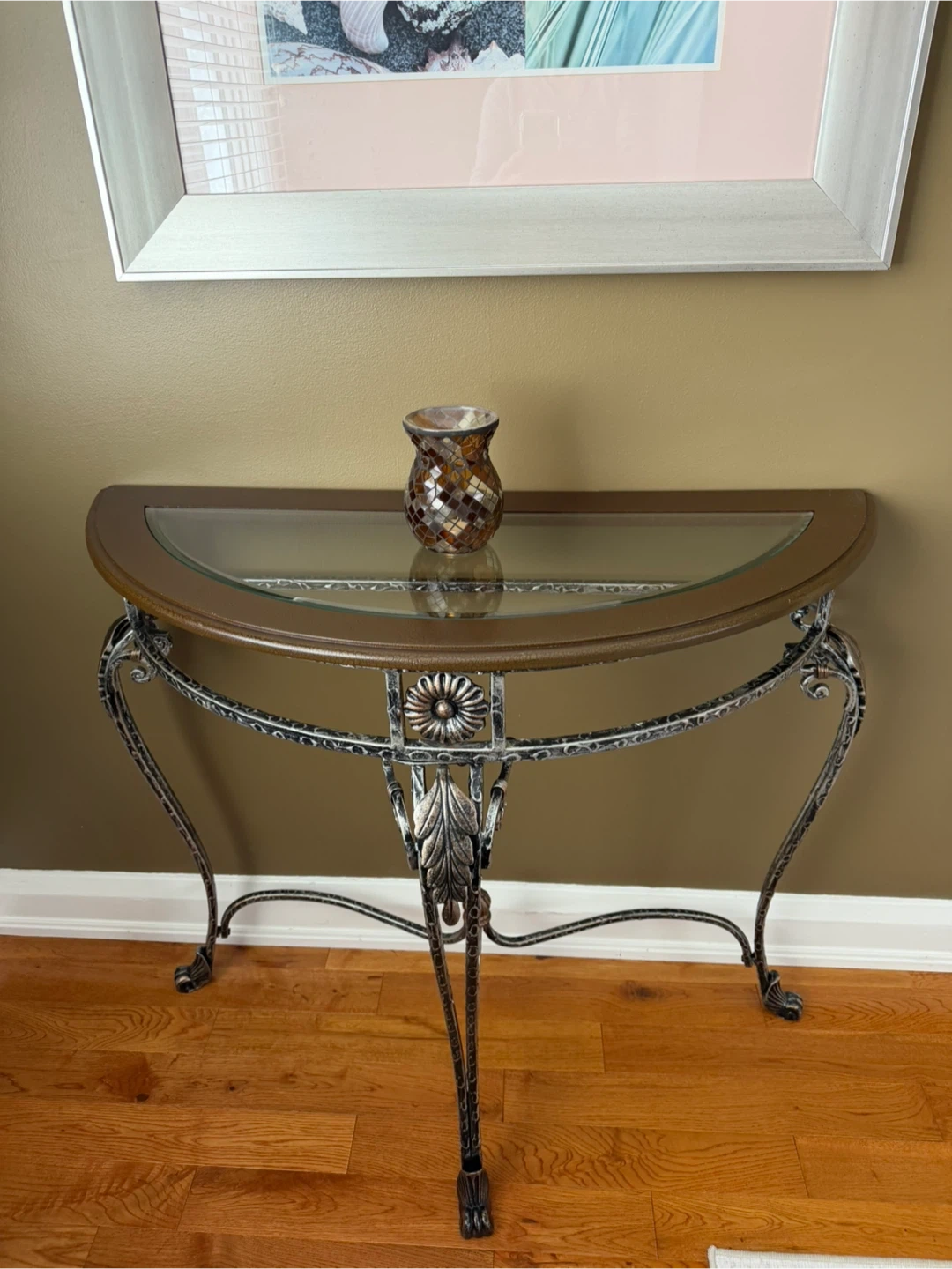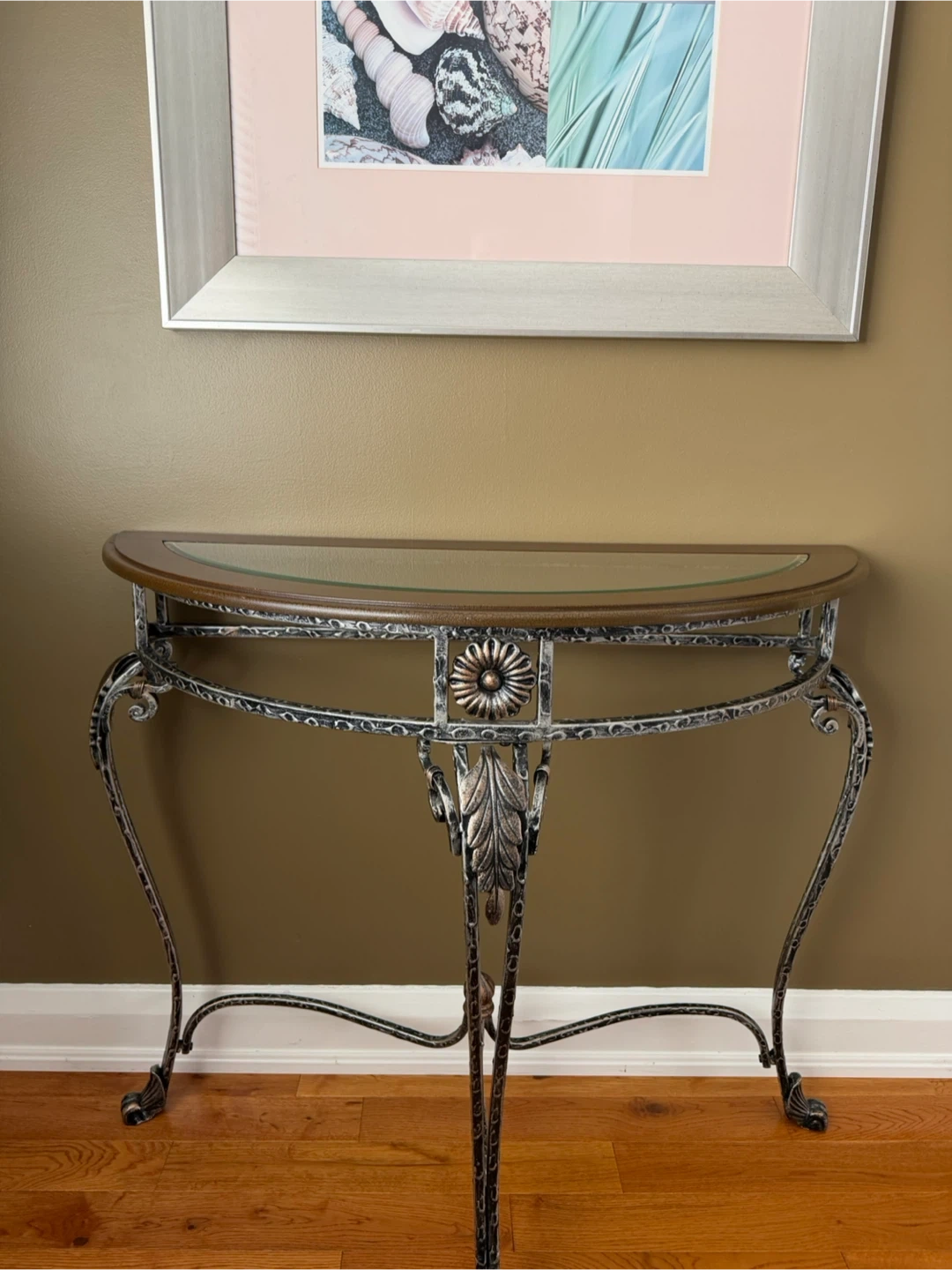 This elegant half-round console table features a decorative metal base and a glass top. It's perfect for entryways or behind a sofa. The metal frame has an antique finish.
