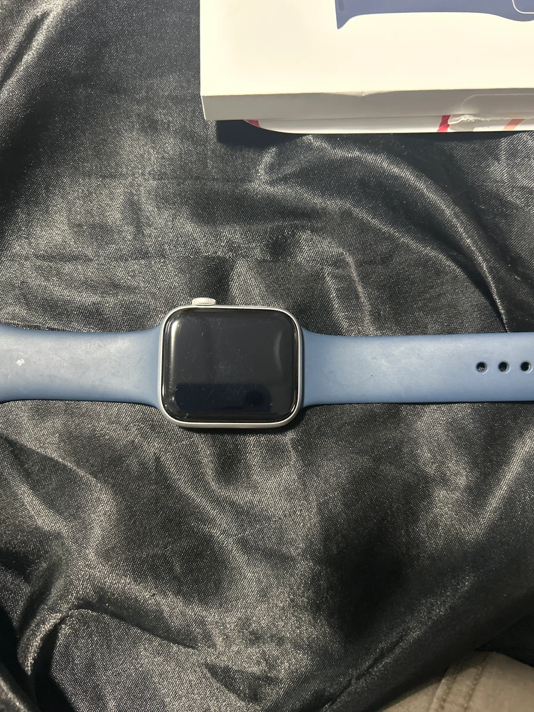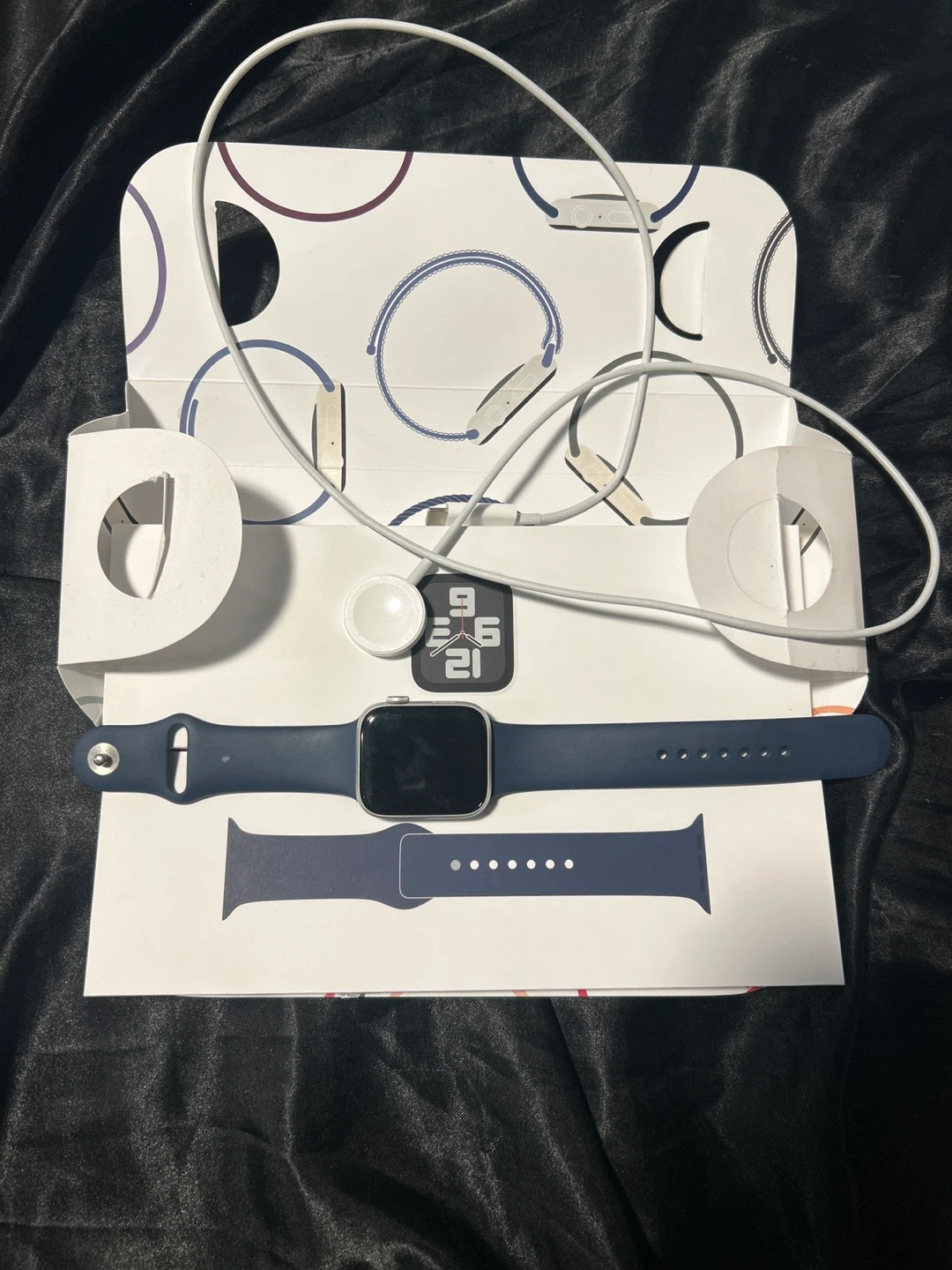 Apple Watch Series 7 in midnight aluminium with a midnight sport band. It's the GPS + Cellular model and the 45mm size. Comes with the original box, charger, and an extra sport band.