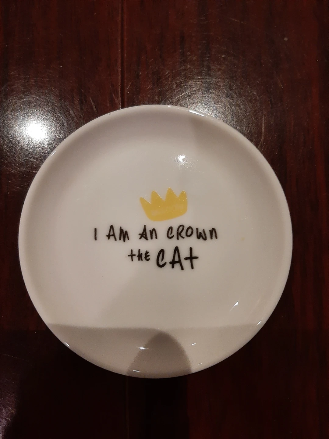 This is a cute small ceramic dish designed for cats. It features the text 'I AM An crown the CAT' with a yellow crown graphic. Perfect for your feline friend's cat treats!