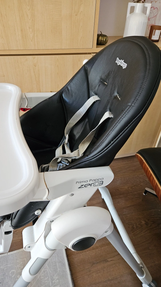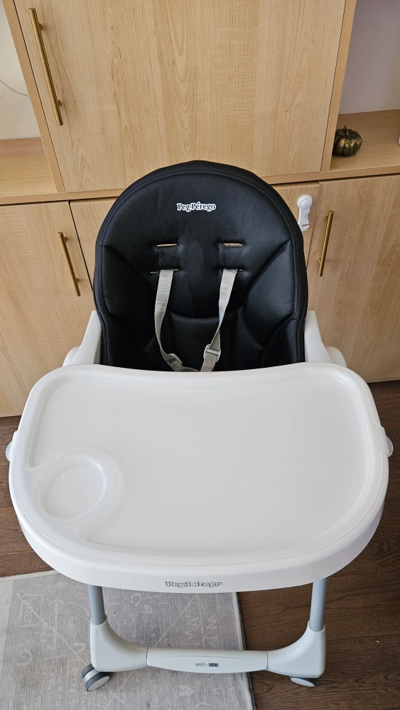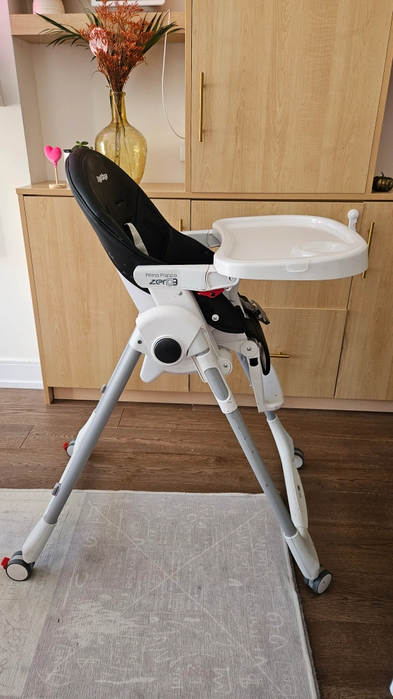 This Peg Perego high chair features a Prima Pappa Zero 3 model. It has a black seat and white tray, with a durable frame and wheels for easy movement. The seat is made of faux leather. It's suitable for mealtimes and playtime for young children.