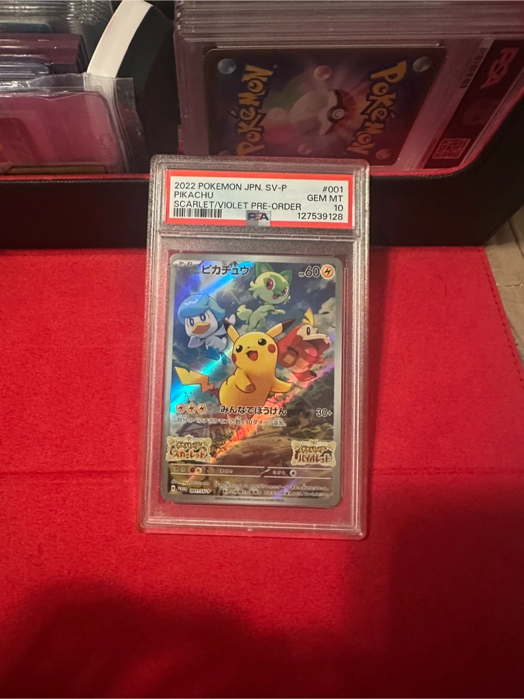 This is a 2022 Pokemon JPN SV-P card featuring Pikachu. It's graded GEM MT 10 by PSA. The card is part of the Scarlet & Violet pre-order series.
