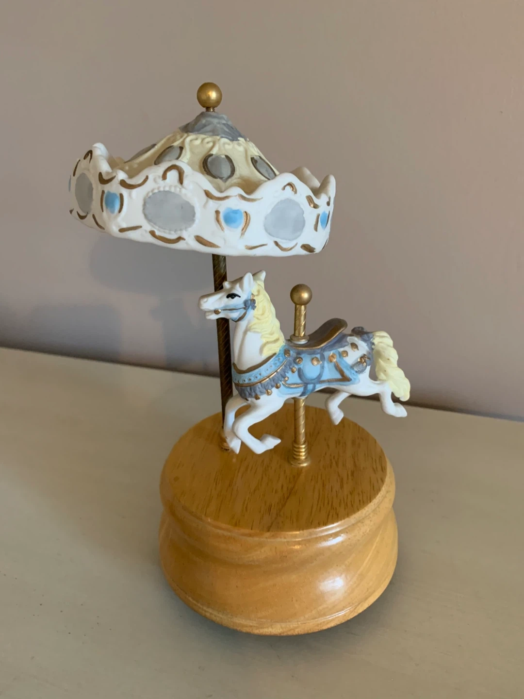This is a charming carousel featuring a white horse with blue and gold accents. The music box has a wooden base and a decorative canopy. It plays a melody when wound up. It's a lovely decorative piece for a shelf or dresser.