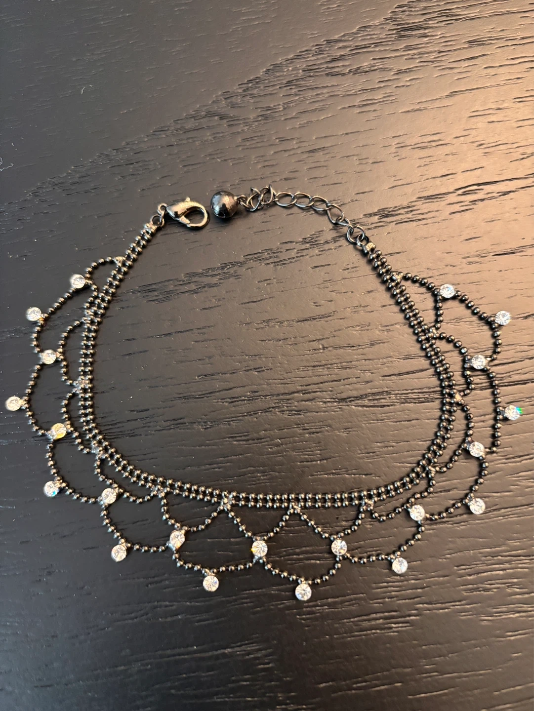 A delicate anklet featuring two strands of small black beads with dangling sections adorned with rhinestones. It has a clasp closure. Perfect for adding a touch of sparkle to an outfit!