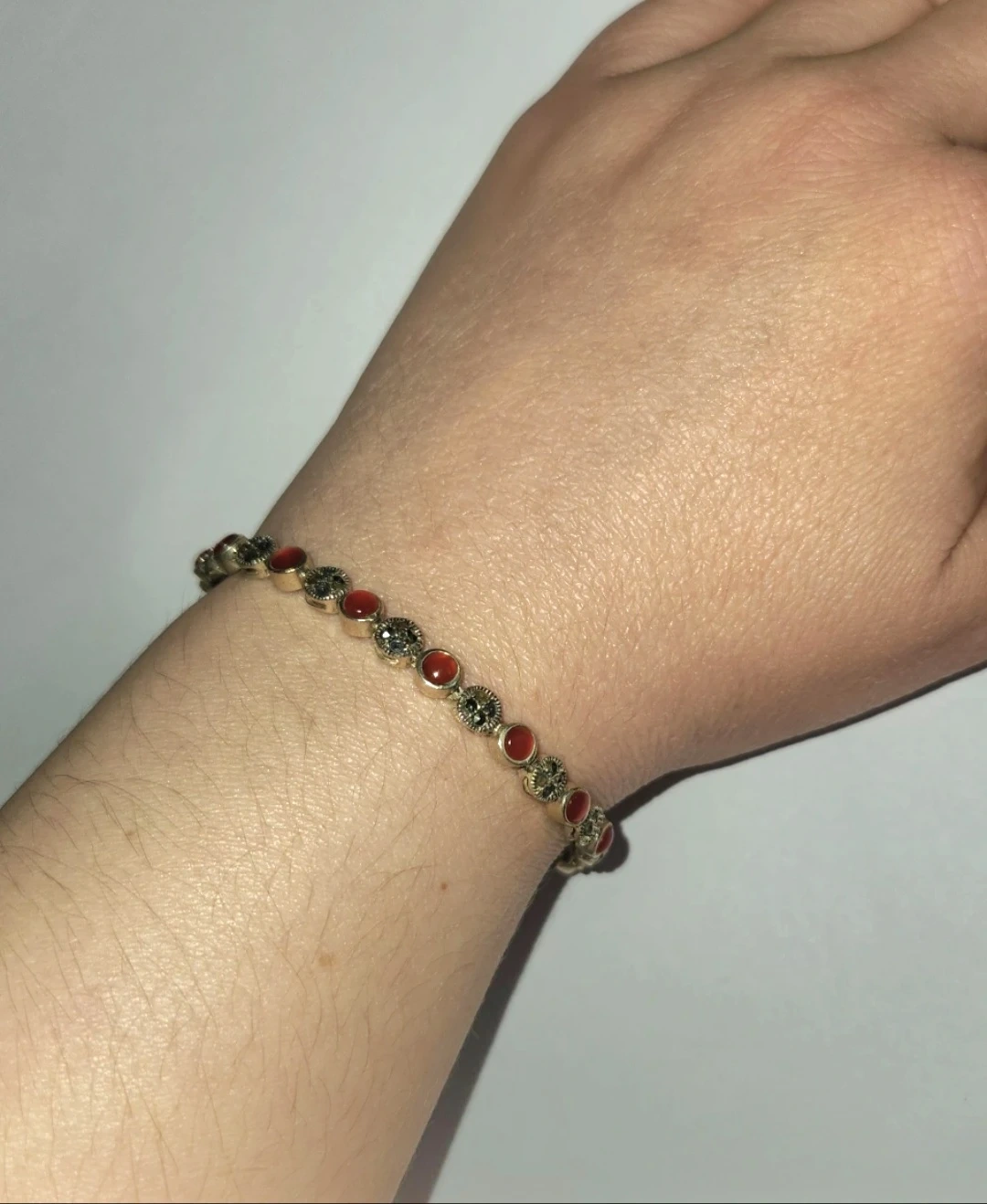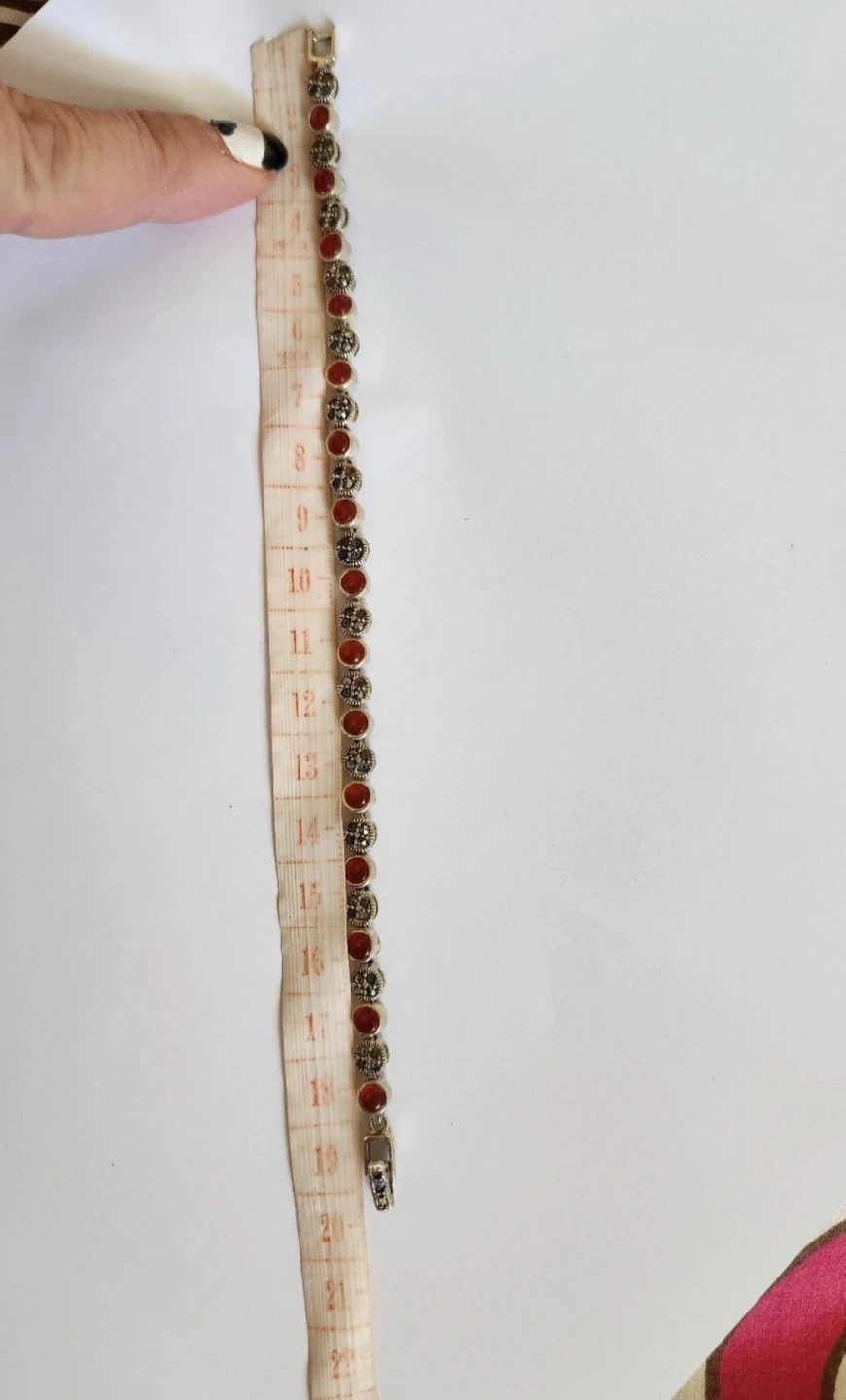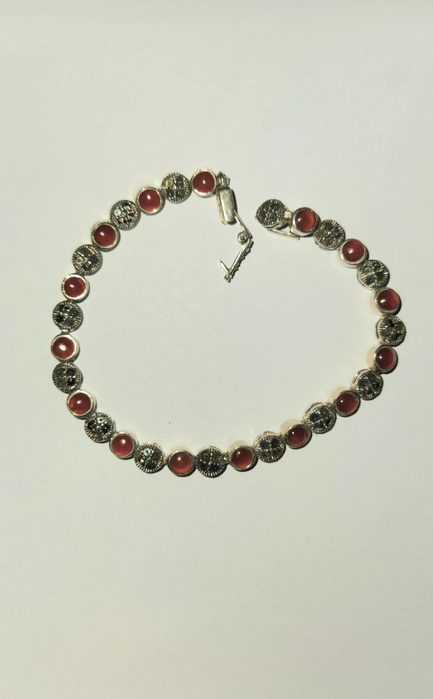Beautiful vintage sterling silver (925) bracelet with rich red stones and sparkling marcasite accents. About 7,5 inches long with a secure clasp. Elegant, timeless piece in great condition.