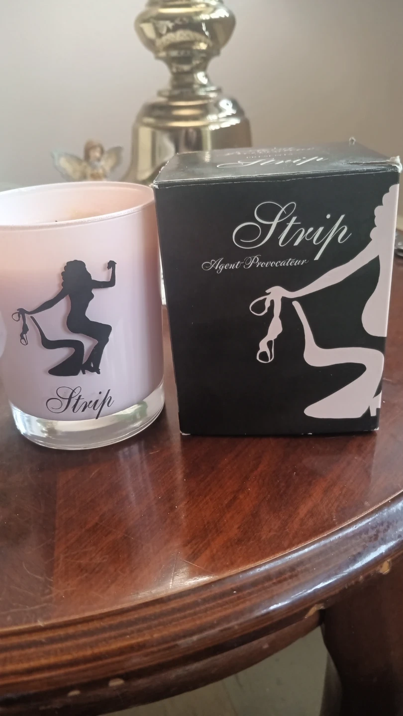 This Agent Provocateur 'Strip Tease' candle has a signature fragrance with notes of Vetivert, Haiti, Amber, Musk, Saffron, Moroccan Rose Oil, Egyptian Jasmine, French Magnolia, and Ylang Ylang. It has a burning time of up to 100 hours. The candle is housed in a pink glass with black silhouette detailing.