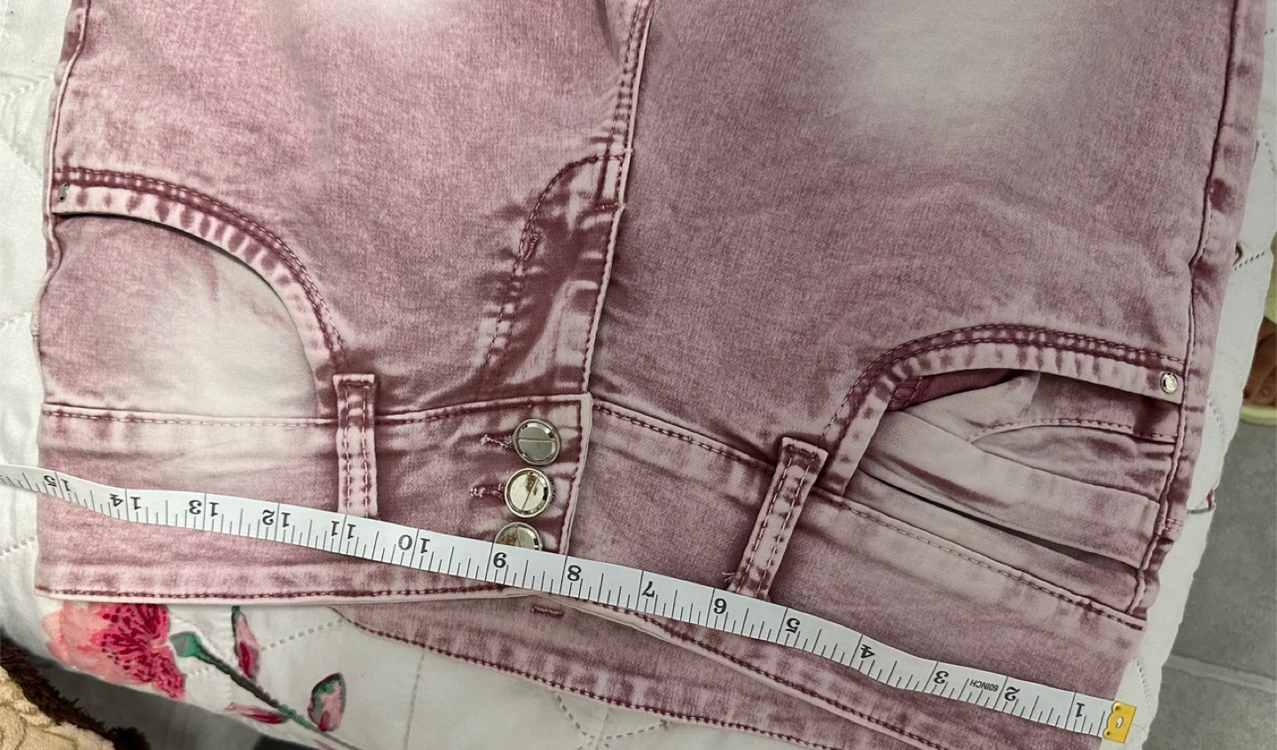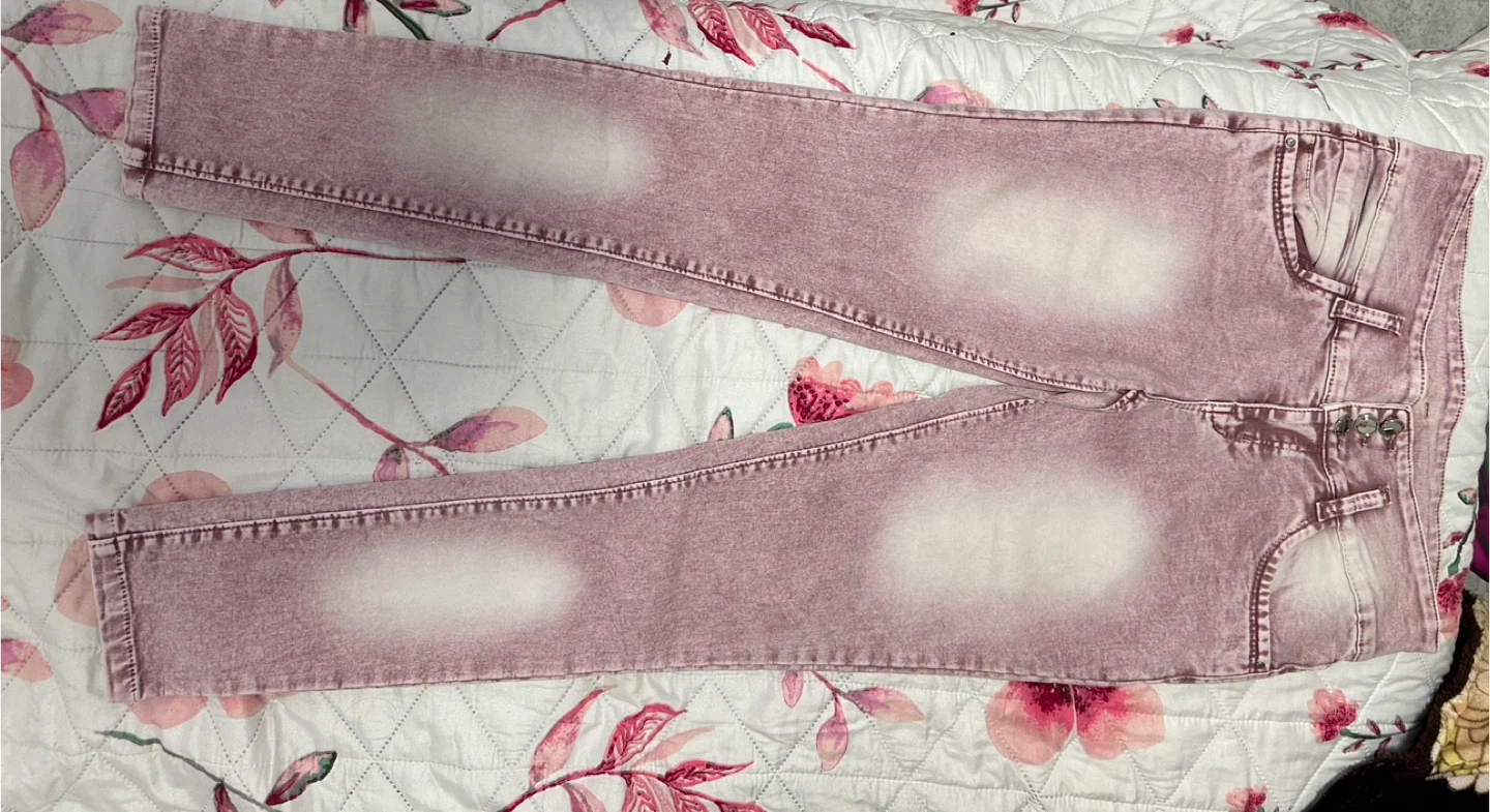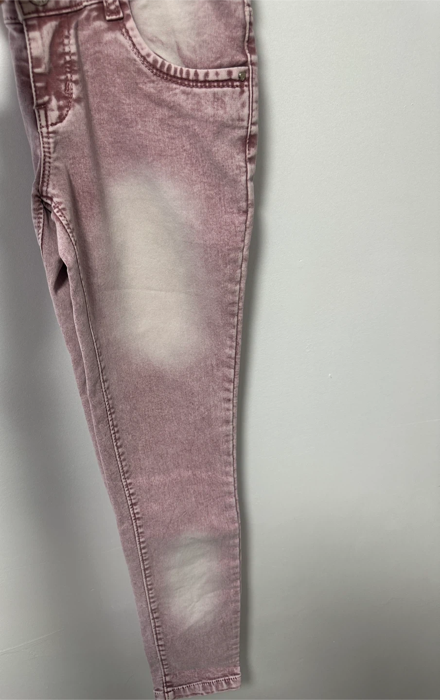 For sale are pink acid wash jeans with a distinctive faded appearance. The jeans have a button fly closure and a waist measurement of approximately 28 inches. They are comfortable to wear. The price is open to negotiation.