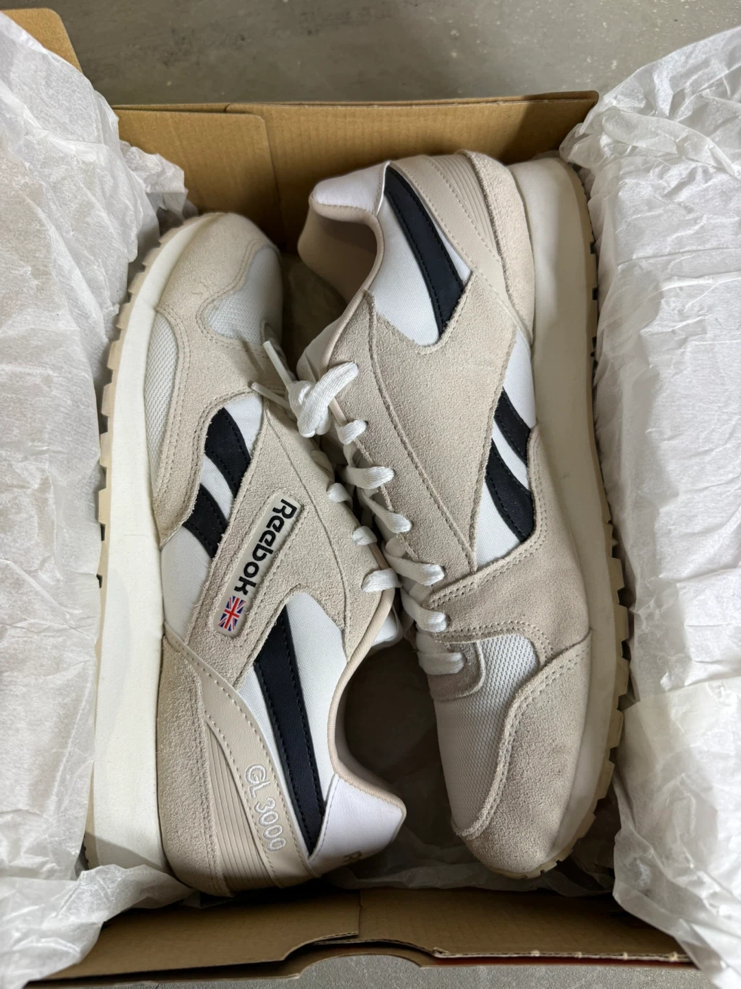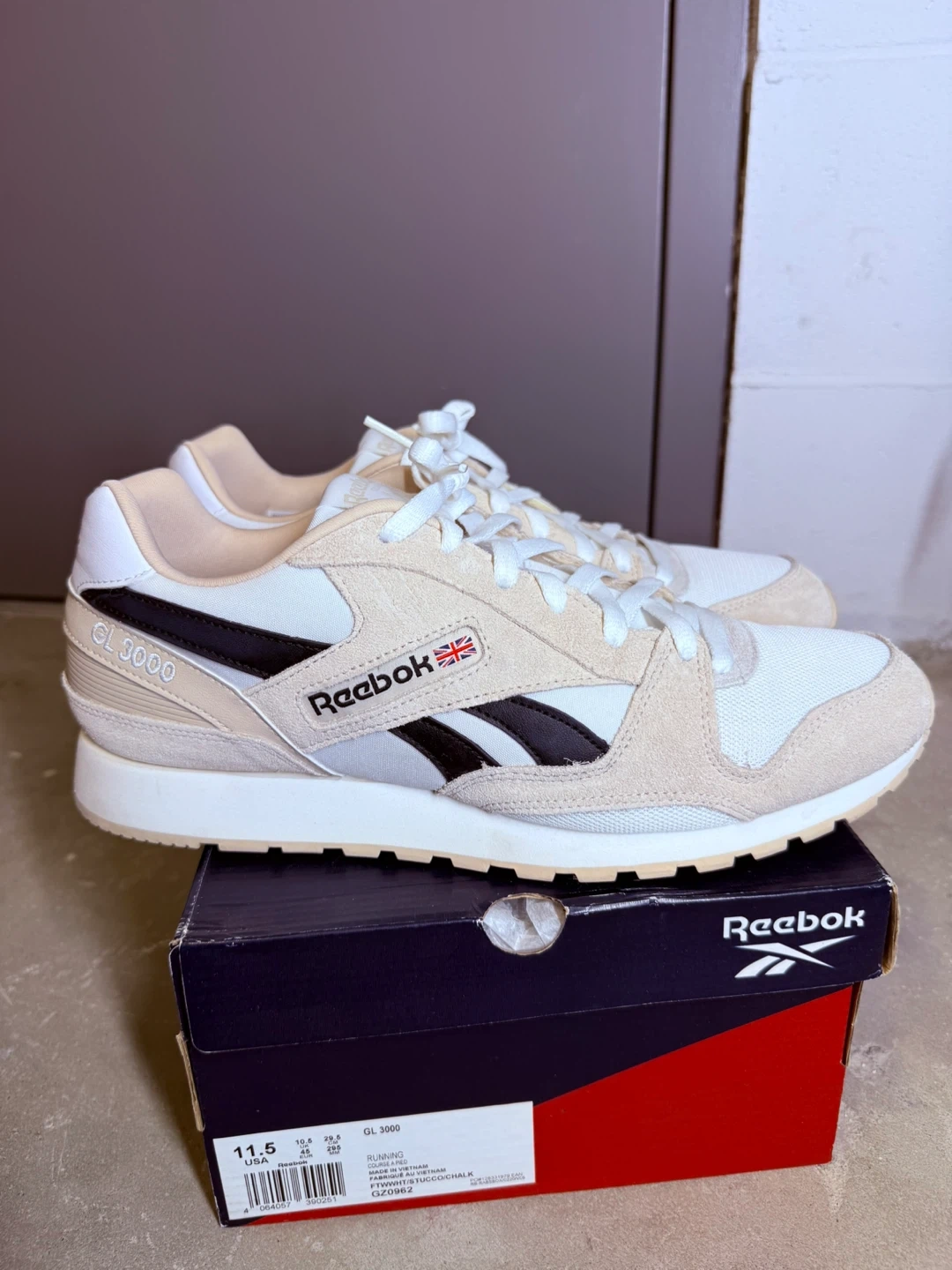 These Reebok GL 3000 sneakers come in a classic beige and white colourway. They feature a combination of suede and mesh uppers. Includes the original box. Size is 11.5 US men's.