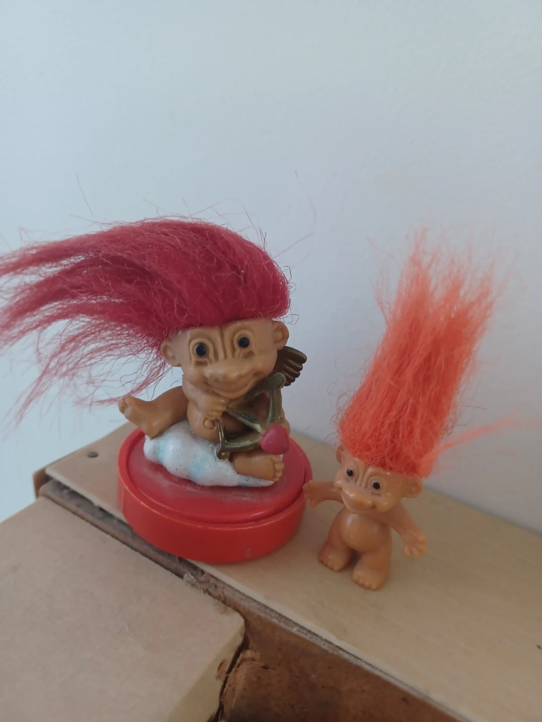 This is a vintage troll doll figure with a heart stamp on its base that reads 'I love you'. It has bright red hair and tiny wings, giving it a cupid-like appearance. Includes a red stamp lid.