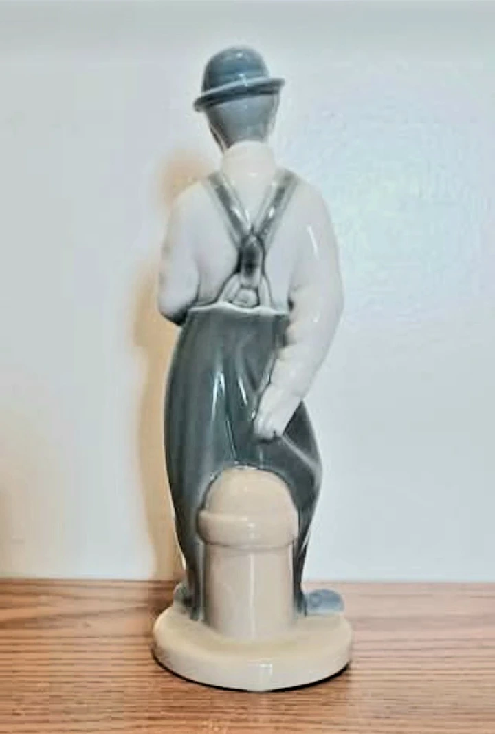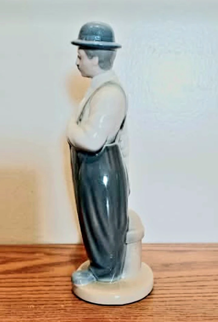 This is a vintage. Requena Charlie Chaplin Figurine. It depicts Chaplin wearing his signature bowler hat, baggy trousers, and holding a cane. The design is known for its realistic shape and colors.