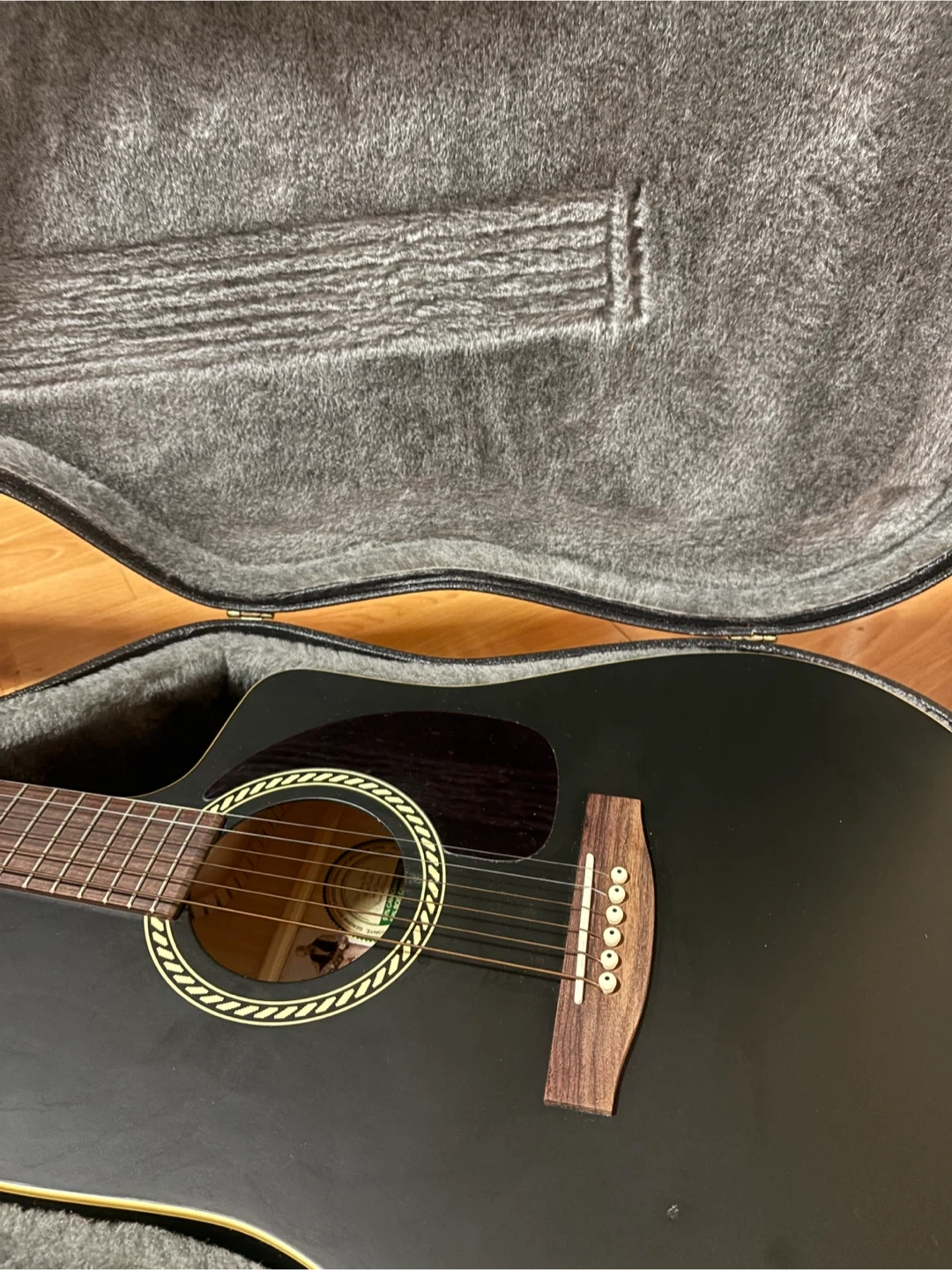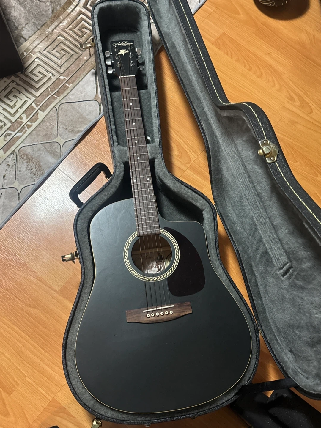 This is an Art & Lutherie "Wild Cherry CW" acoustic guitar in black. It's housed in a hardshell case for protection. Great for beginners and experienced players alike! It’s from a known brand by “ Godin Guitars”