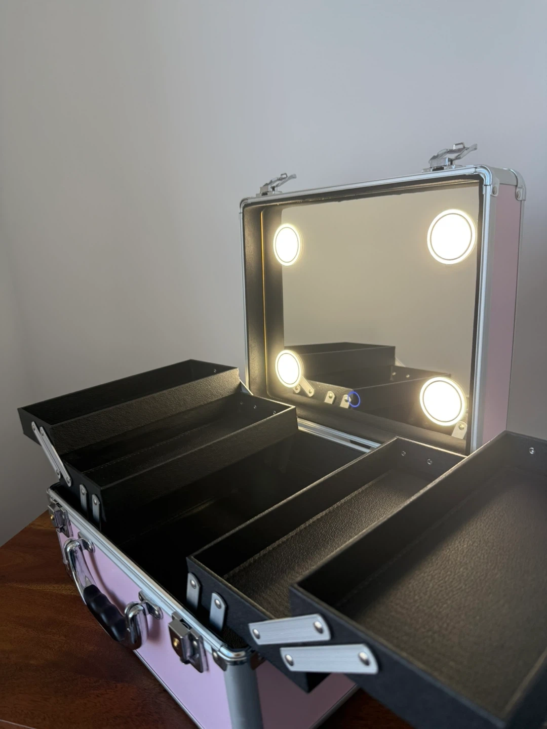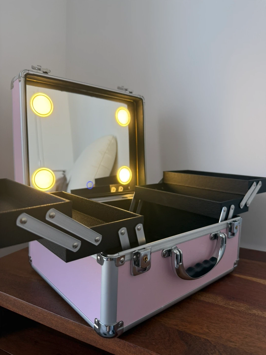 This limited-edition Vanity Trunk is perfect for storing and transporting your beauty essentials. It includes LED lights, a mirror, an aluminum frame, and reinforced corners for durability.