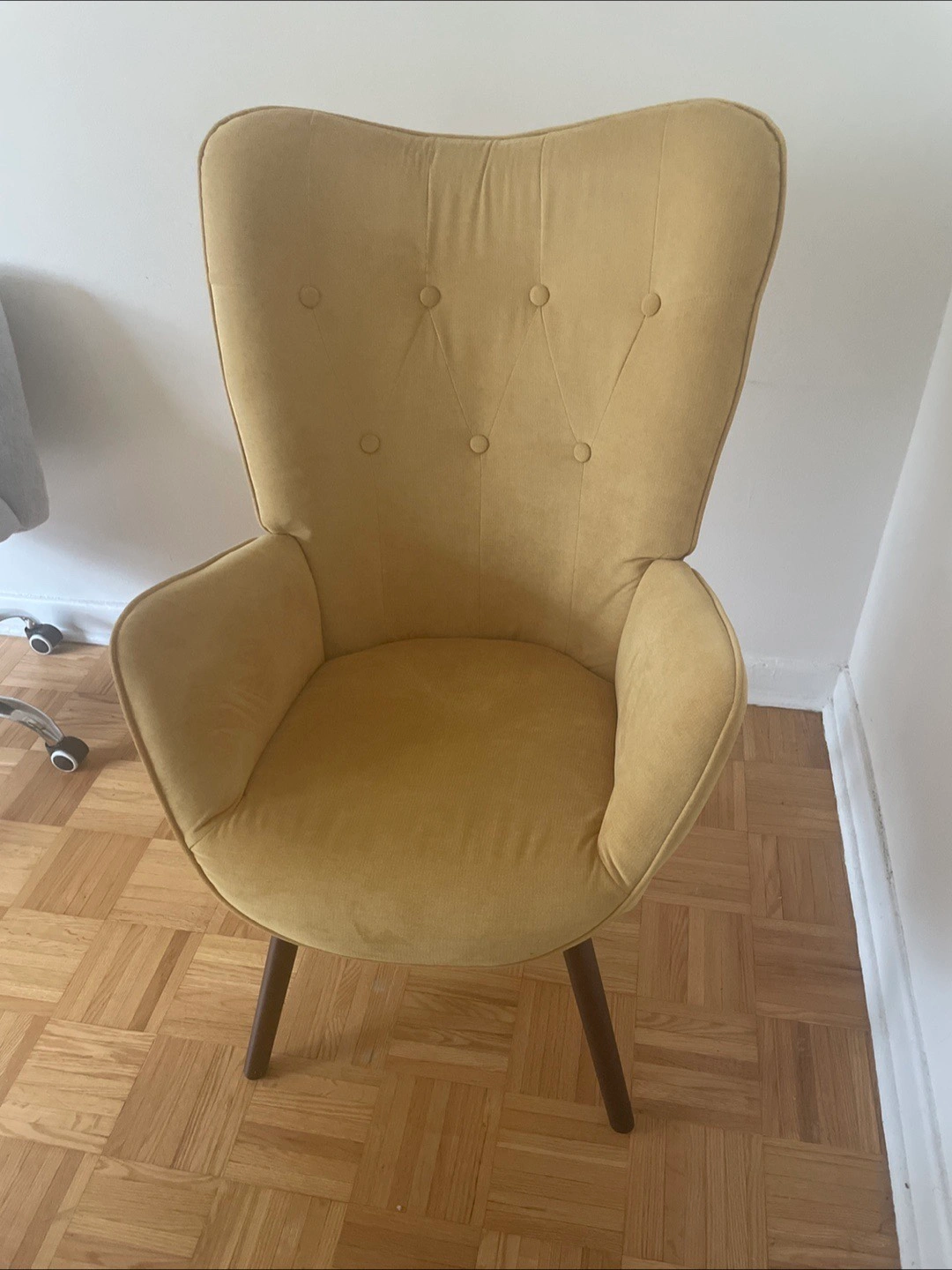 Selling a cute yellow accent chair! It's in great condition and would look lovely in any room. The chair has a stylish design with button detailing on the backrest and sleek wooden legs. It's also very comfortable for sitting and relaxing