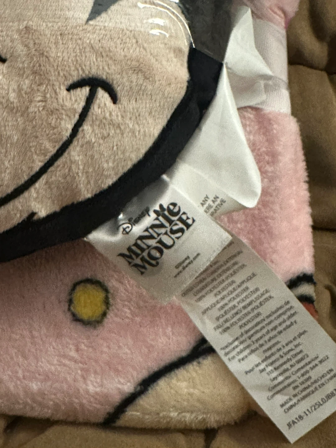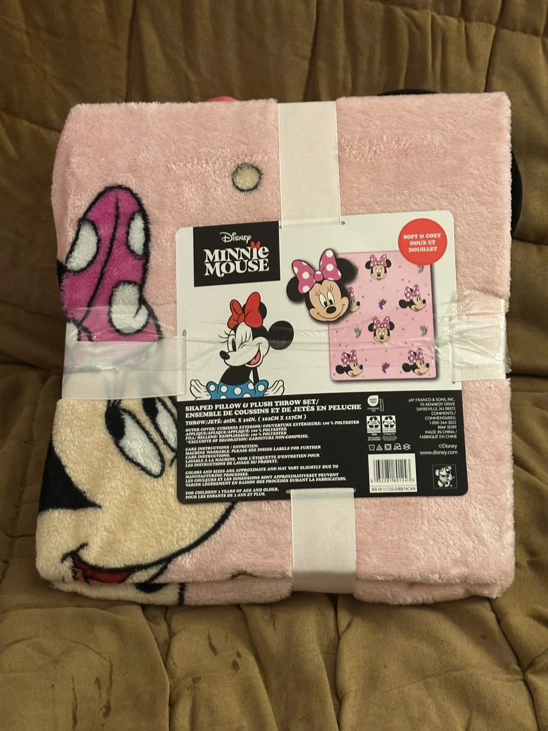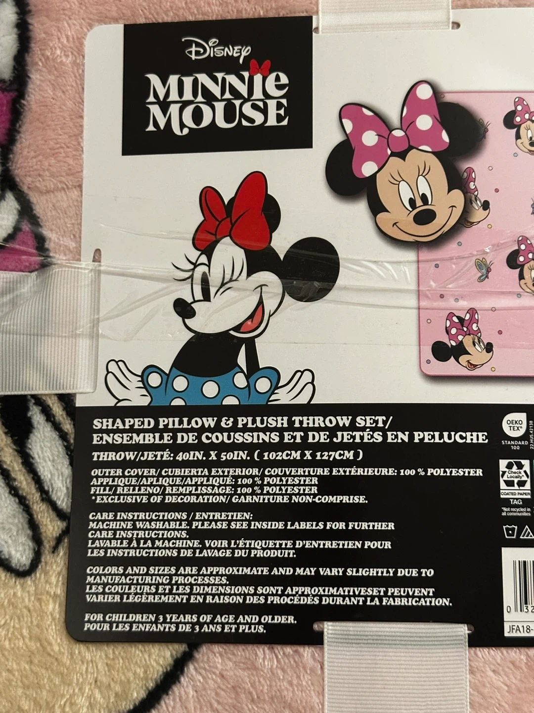 This set features a soft Minnie Mouse shaped pillow and a pink plush throw. The throw is made of 100% polyester. It's great for children aged 3 years and up!