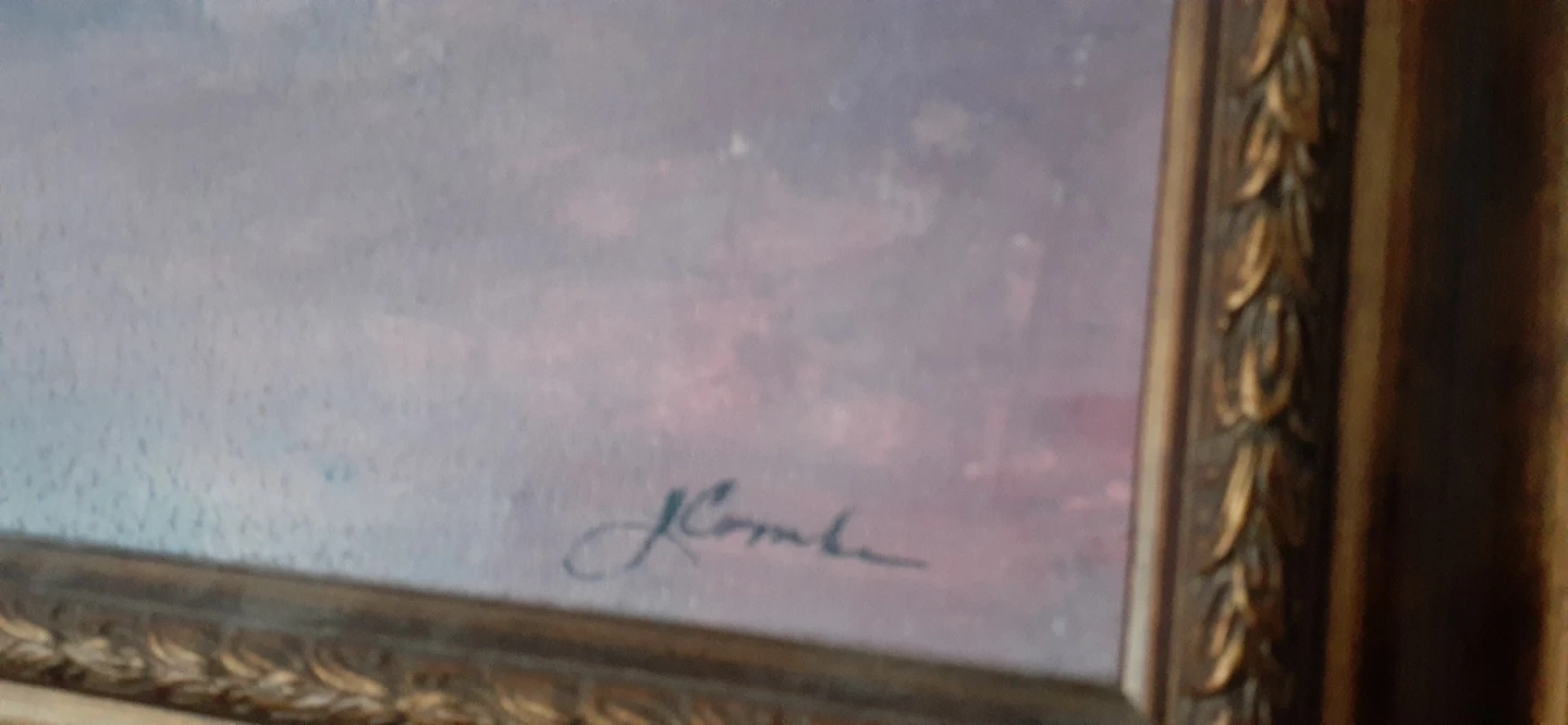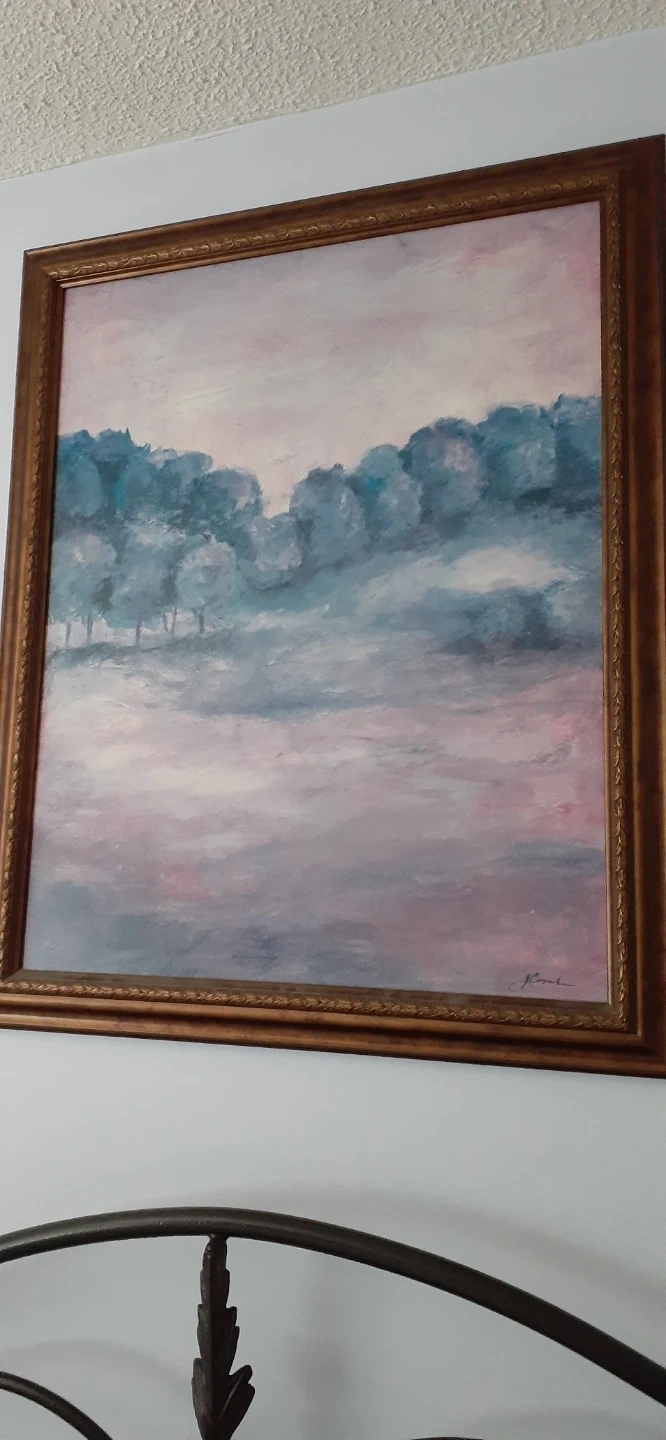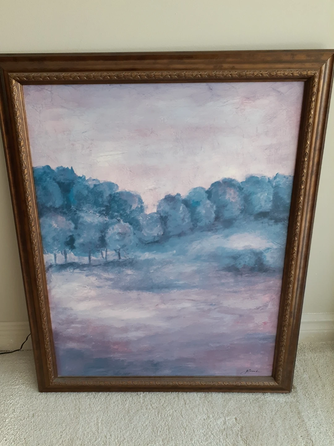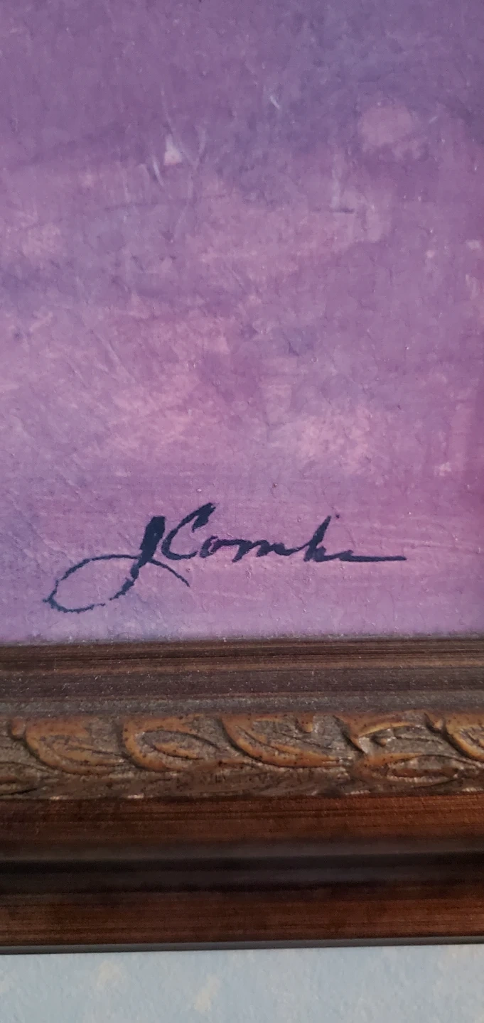This is a framed painting depicting a serene landscape. It features soft purples and blues with a misty forest scene. The signature "J. Combi" is visible on the lower right. Comes in a decorative wooden frame. 31.5" L x 25.5" W
