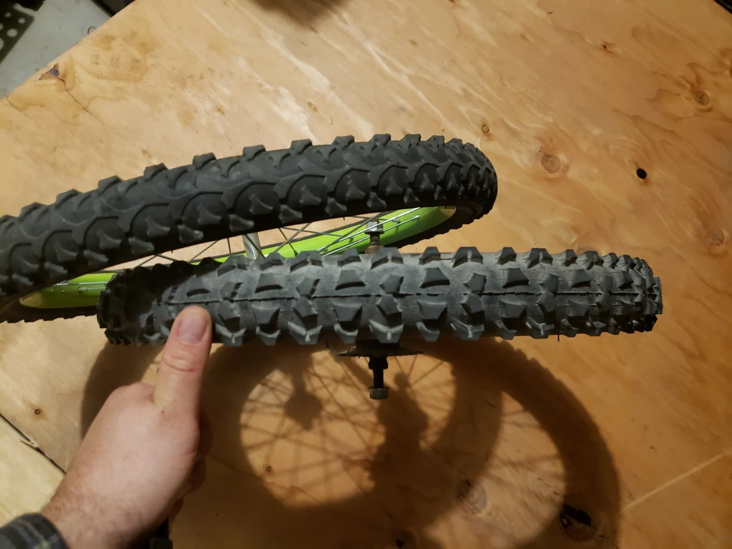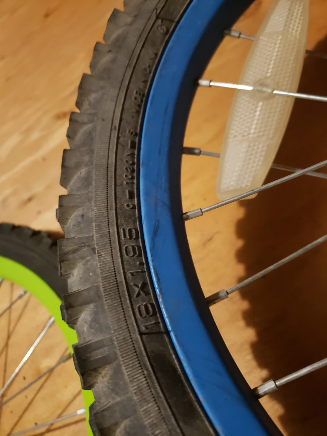 Two kids bicycle wheels, one with a blue rim and the other with a green rim. The blue rim wheel is size 18x1.95. These are ready for your next bike project!