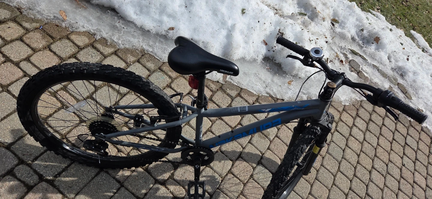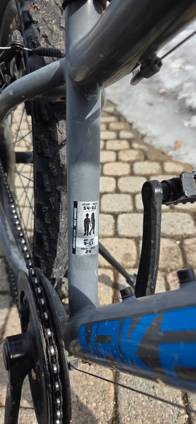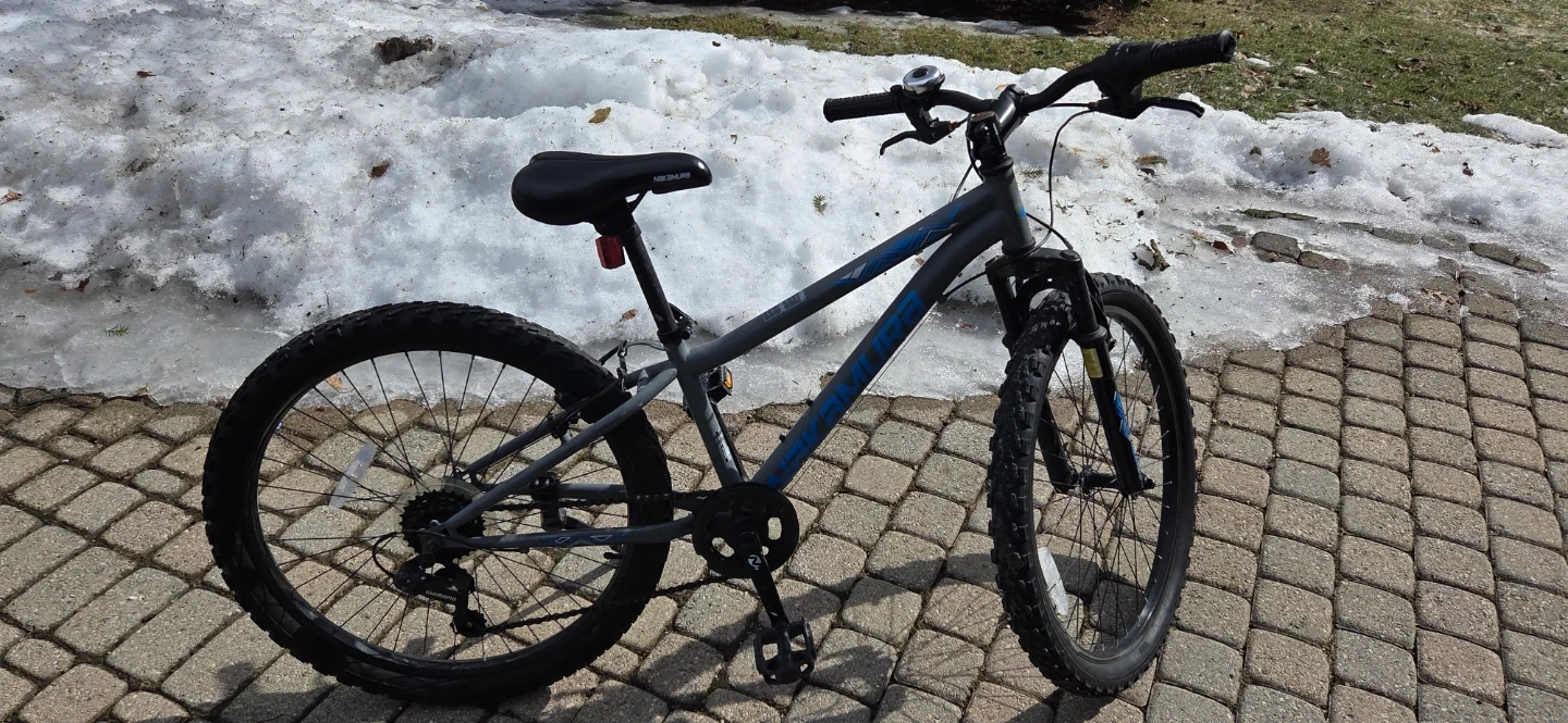 Grey and blue NAKAMURA kids mountain bike with a 24-inch wheel size. It's designed for ages 9-11 or heights between 54-62 inches.