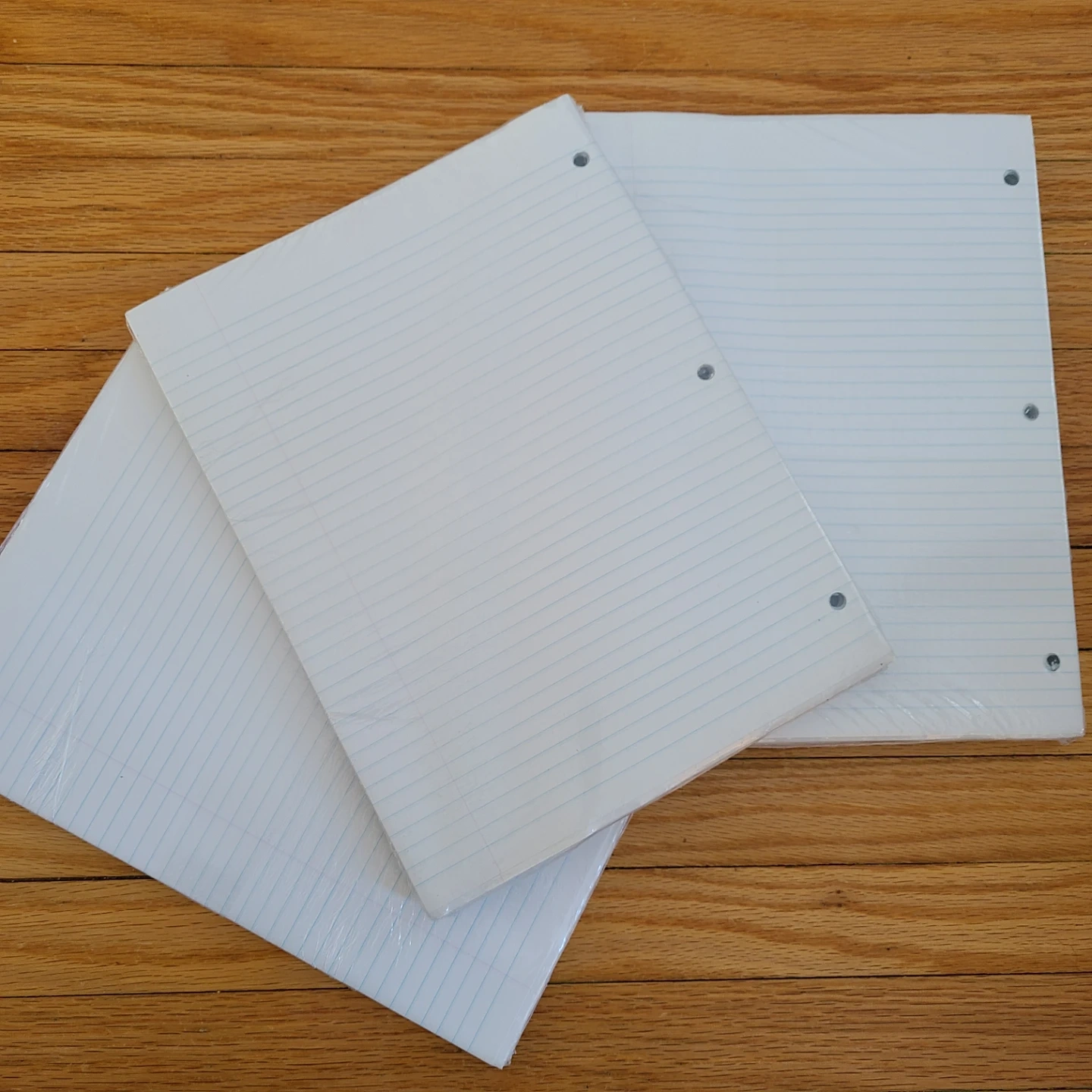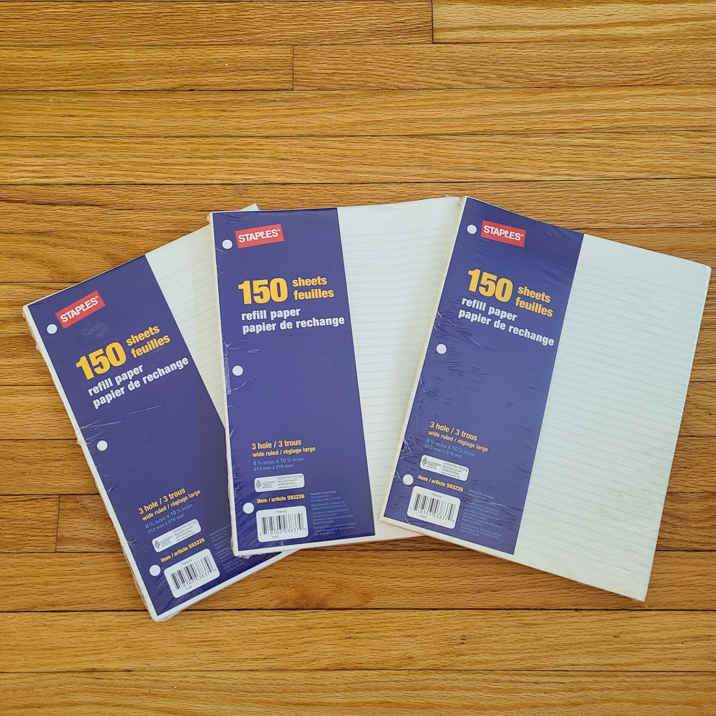 Three packs of Staples refill paper are included. Each pack has 150 sheets of wide ruled paper. It's 3-hole punched for binder use.