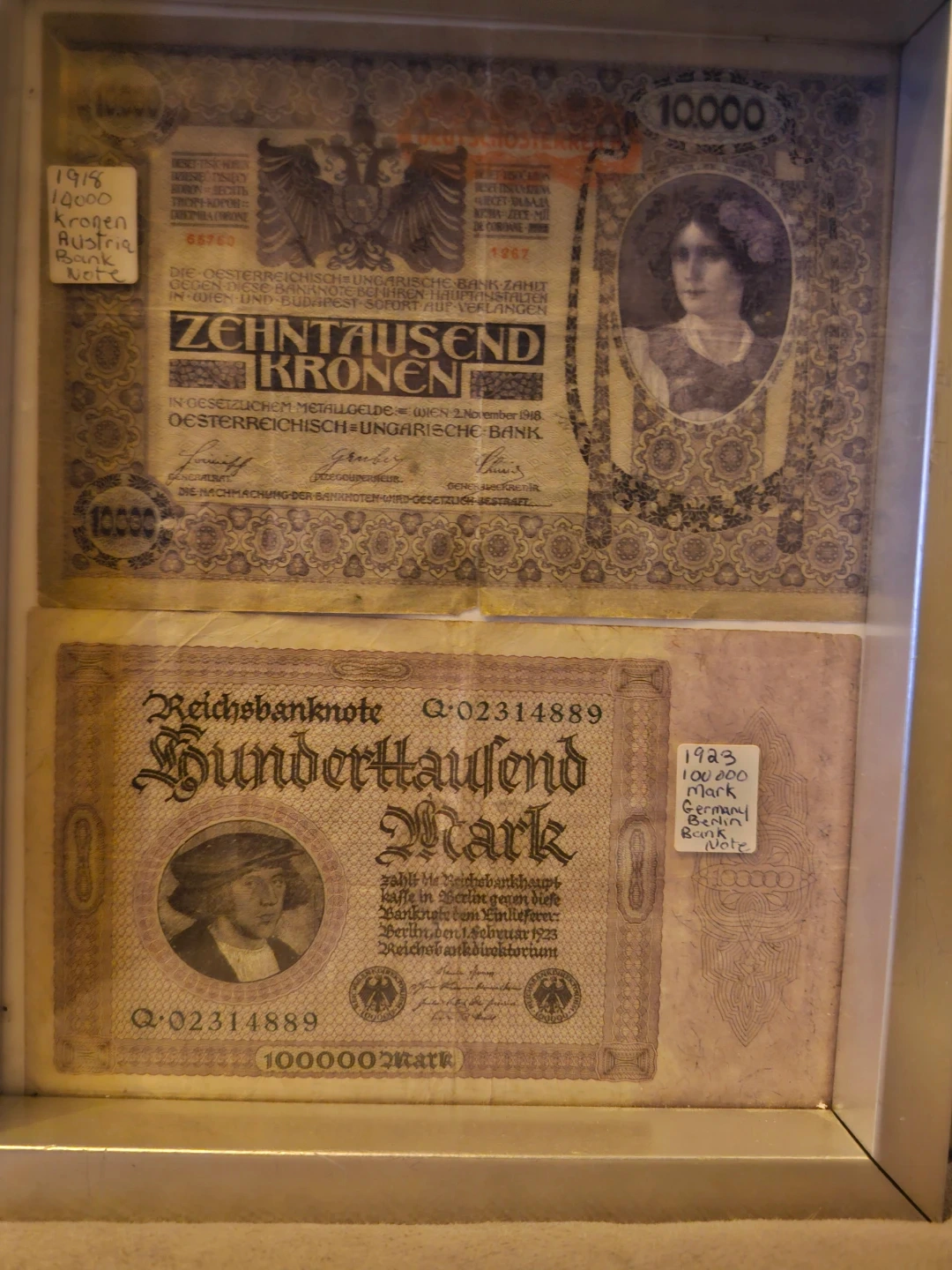 Two vintage banknotes: a 1918 Austro-Hungarian 10,000 Kronen and a 1923 German 100,000 Mark. Both are collectible historical currency items. They are paper notes.