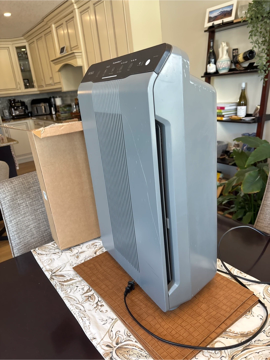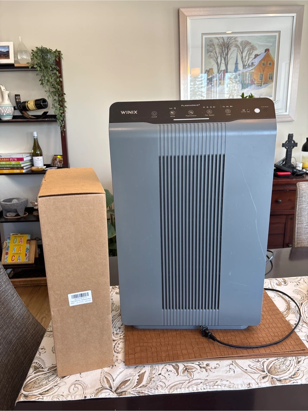 Winix 5300-2 air purifier with PlasmaWave technology. This unit includes the main air purifier and a new filter set still in plastic. It has multiple fan speeds and an air quality sensor. Ready to improve your home's air quality!