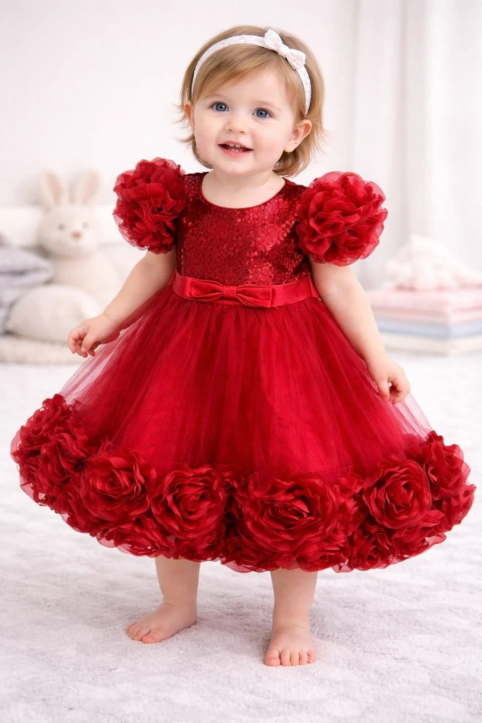 A stunning red dress for little ones, featuring a sequined bodice and a fluffy tulle skirt adorned with fabric roses. It has adorable puff sleeves with rose details and a satin bow at the waist. Perfect for special occasions!