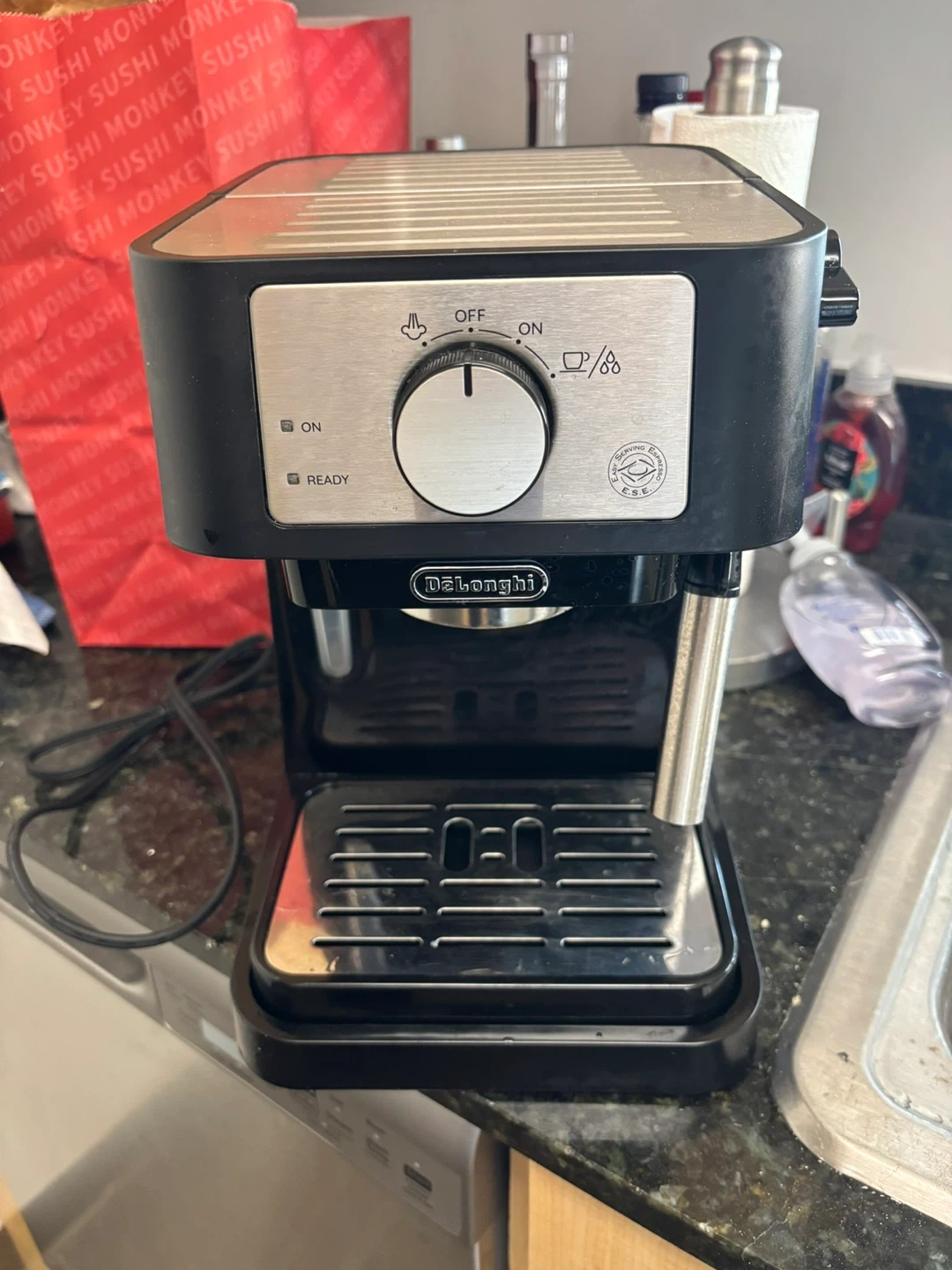 Like brand new. This is a DeLonghi espresso machine. It's black and has a stainless steel top. The machine features a dial for selecting brew options and indicator lights for power and readiness.