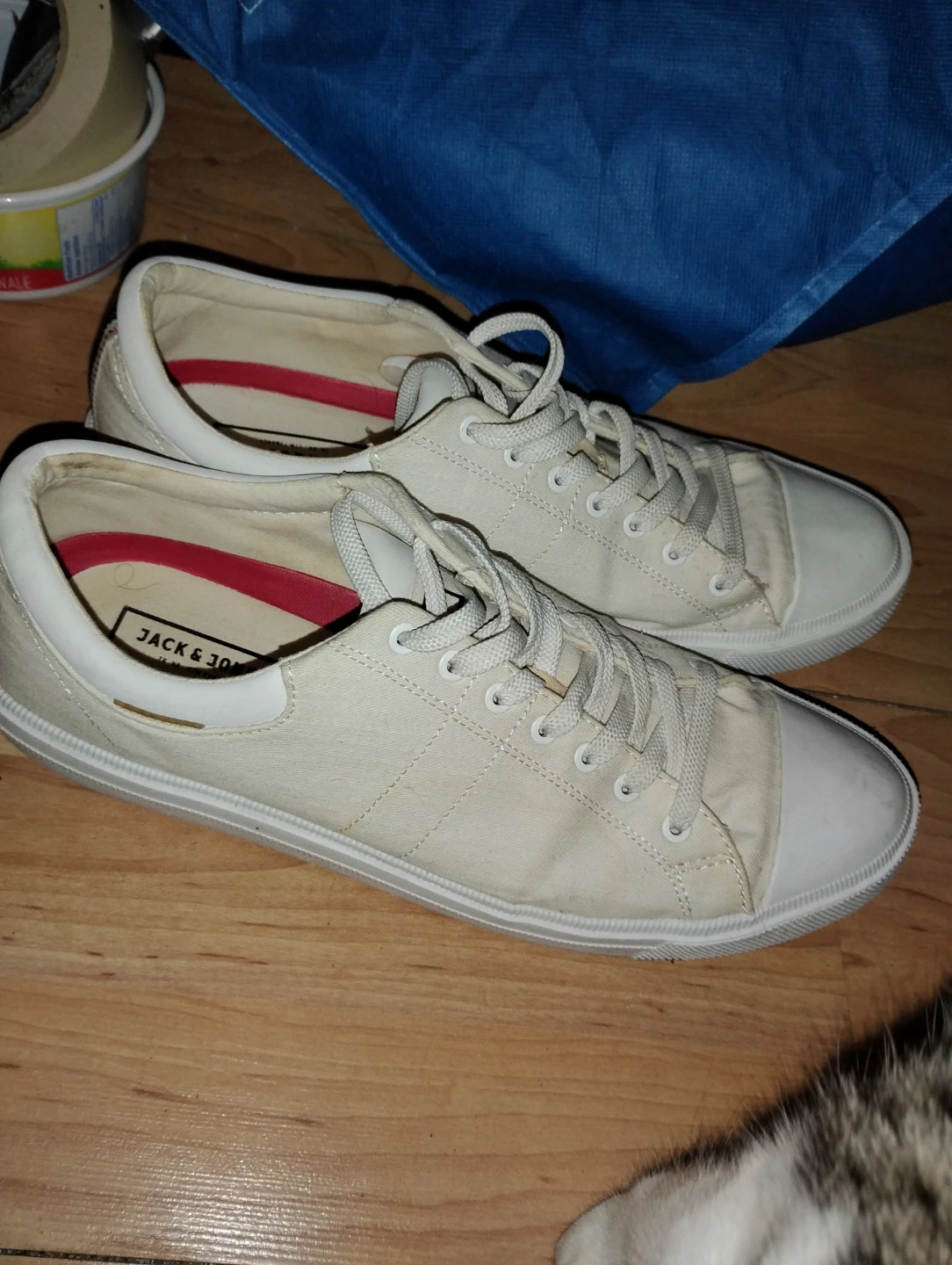 These Jack & Jones sneakers are made of cream-coloured canvas. They feature a white sole and lace-up closure. The interior lining is red and white.