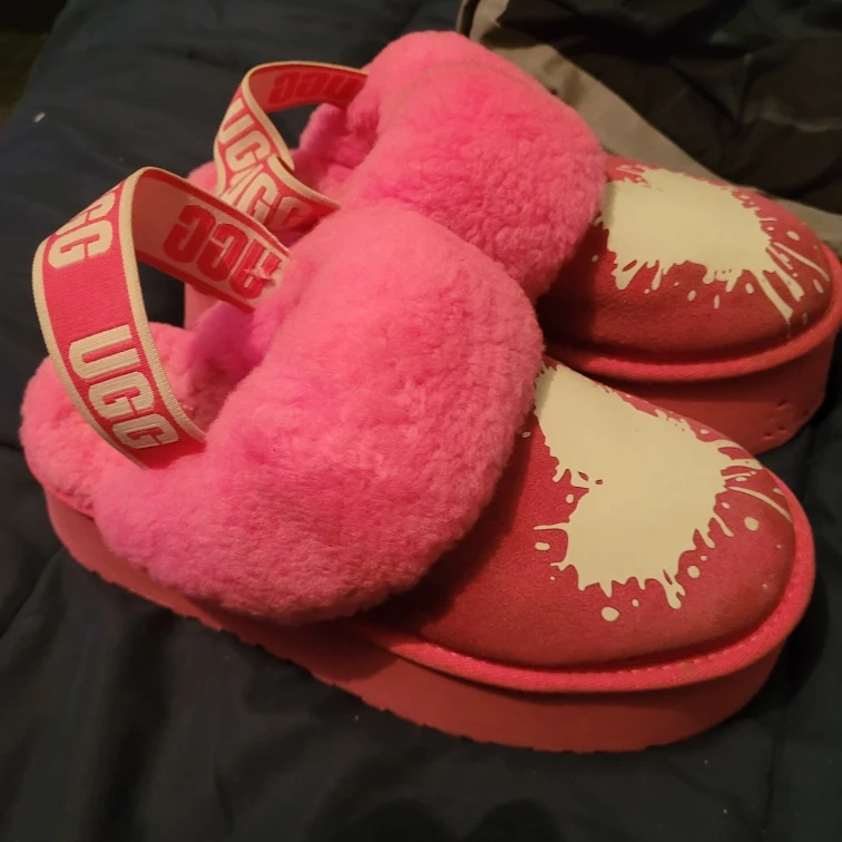 These UGG Fluff Yeah slides are in a vibrant pink colour! They are super comfortable and stylish for everyday wear. The UGG logo is prominently displayed on the strap. Perfect for adding a pop of colour to your outfit!