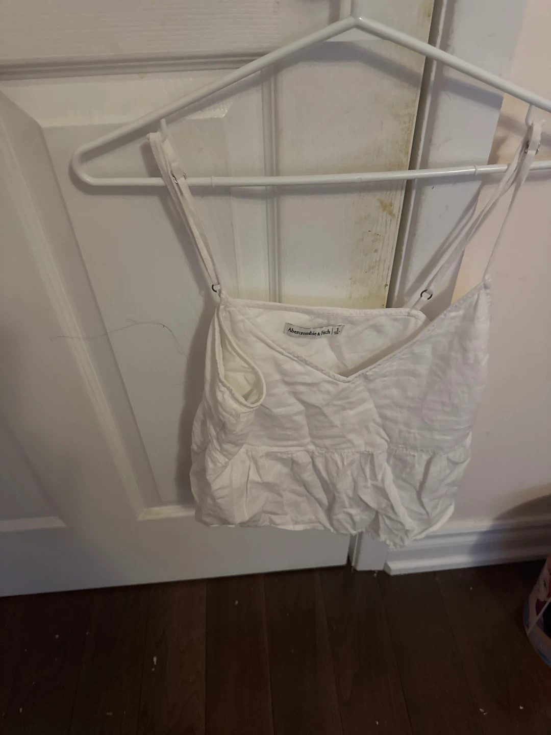 White camisole top from Abercrombie & Fitch. It's a sleeveless, V-neck style with adjustable spaghetti straps. Ruffle detailing at the hem. Cotton material.