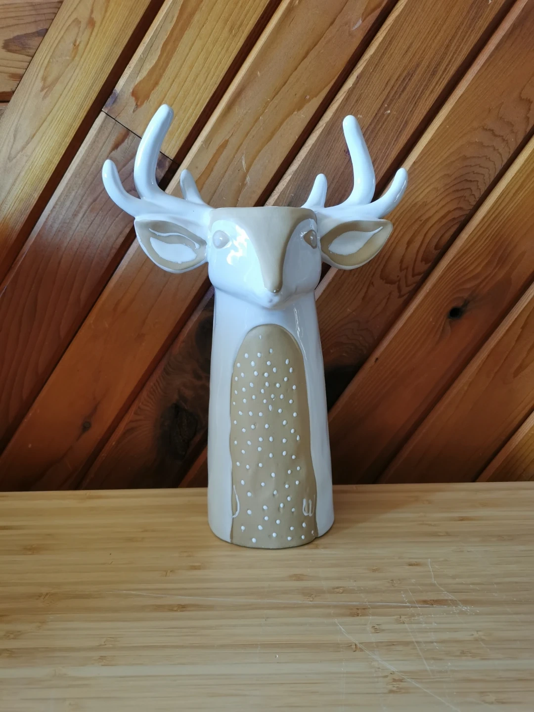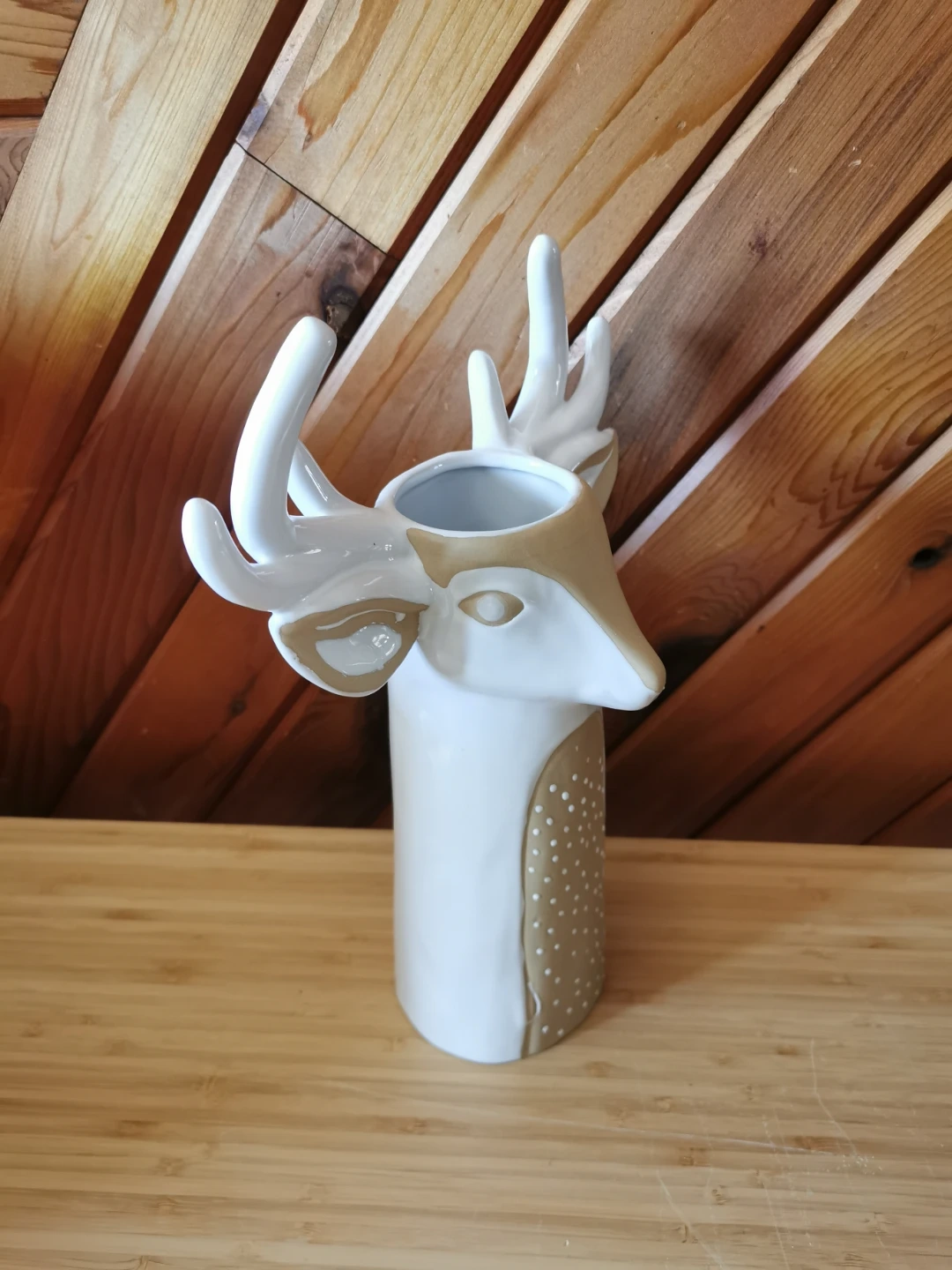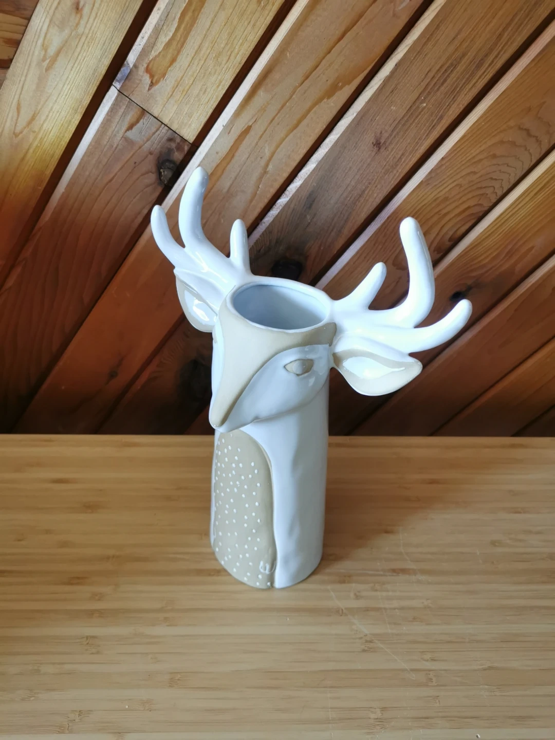 Beautiful Anthropologie ceramic deer / stag vase in a soft neutral cream and taupe palette. Features sculptural antlers, sweet hand-painted facial details, and a whimsical woodland design that makes it perfect as a statement decor piece, dried floral holder, or seasonal accent.