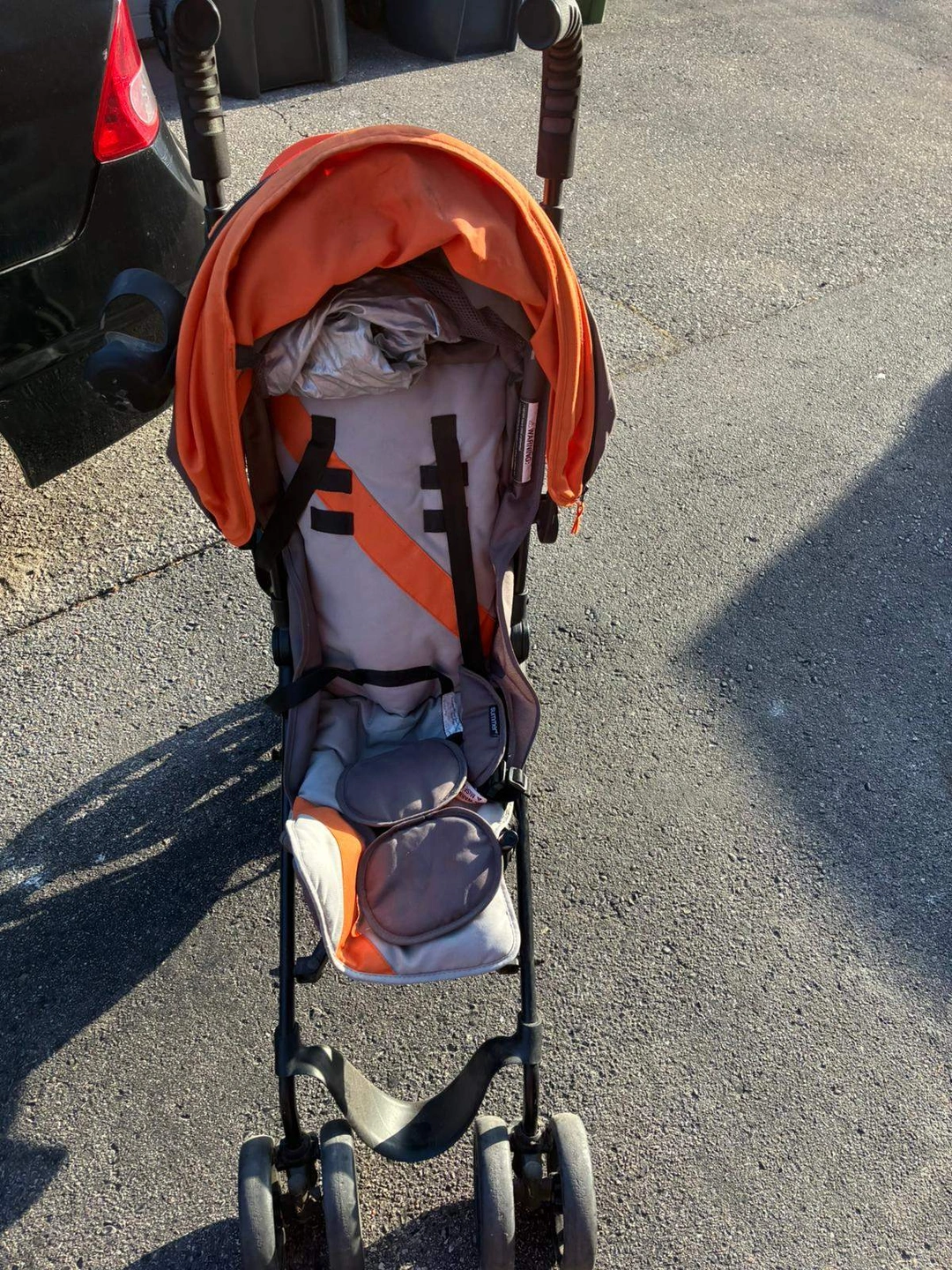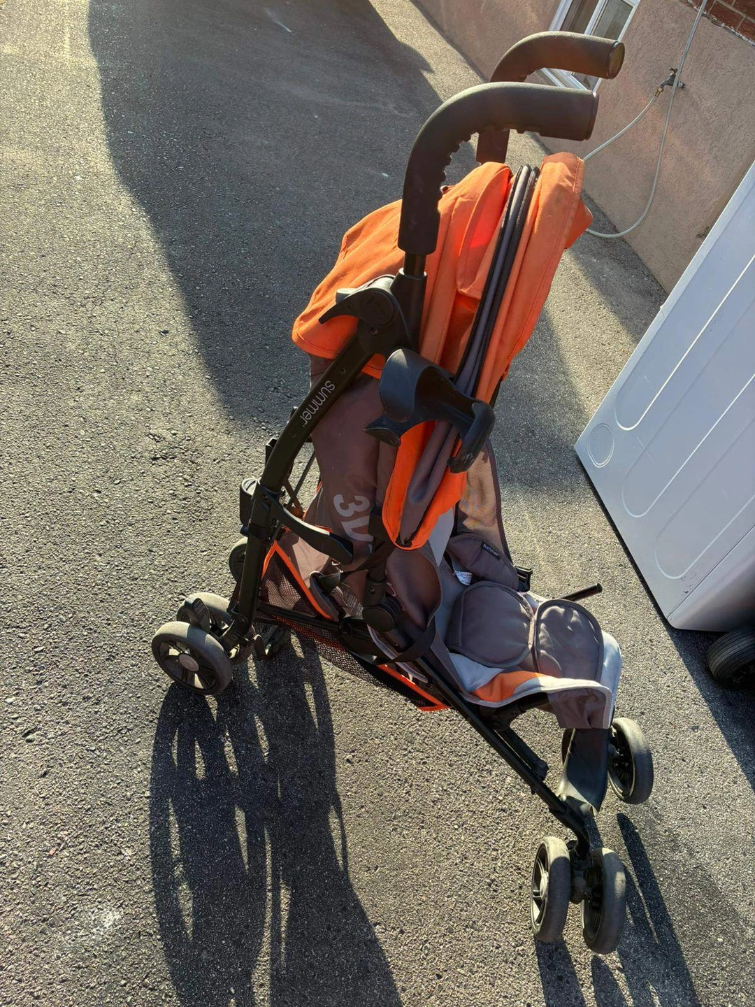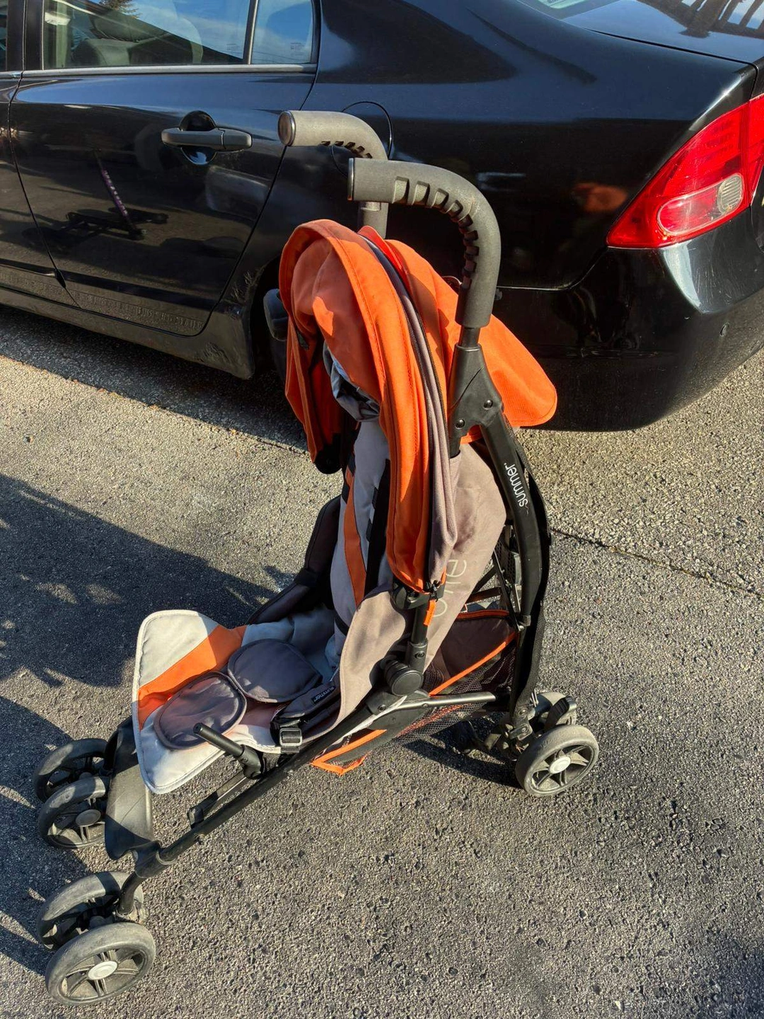 Features include a one hand fold, one hand recline, one hand adjustable footrest, and a one hand adjustable canopy
