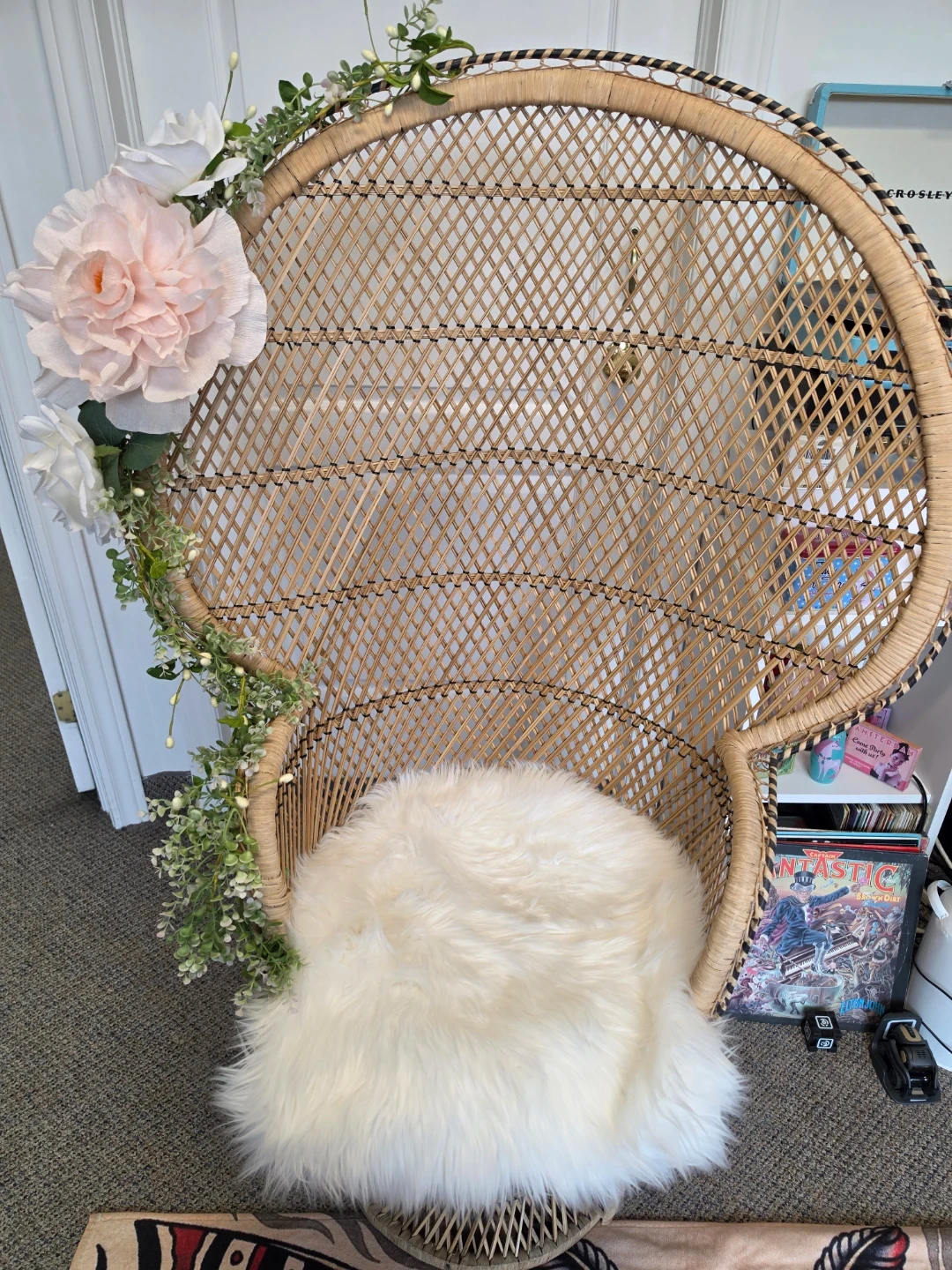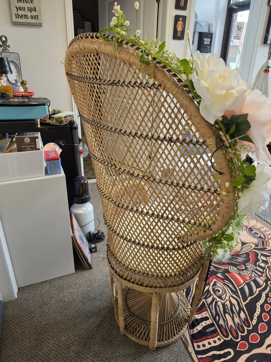 This wicker peacock chair features a decorative floral arrangement and a plush white cushion. It's perfect for adding a bohemian touch to any room. The chair is made of natural rattan material.The green pillow it is not included.